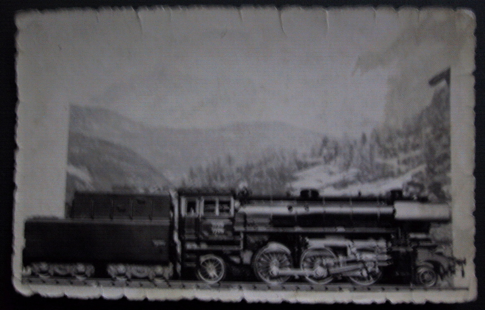 Auf deinem Bild ist eindeutig eine Modellbahnlokomotive der Baureihe 23 von Märklin abgebildet. Dahinter ein Landschaftsbild, um das Lokomotivphoto "echt" wirken zu lassen. Ich hab diese Lok in meiner Modellbahnsammlung (Bj. 1957).