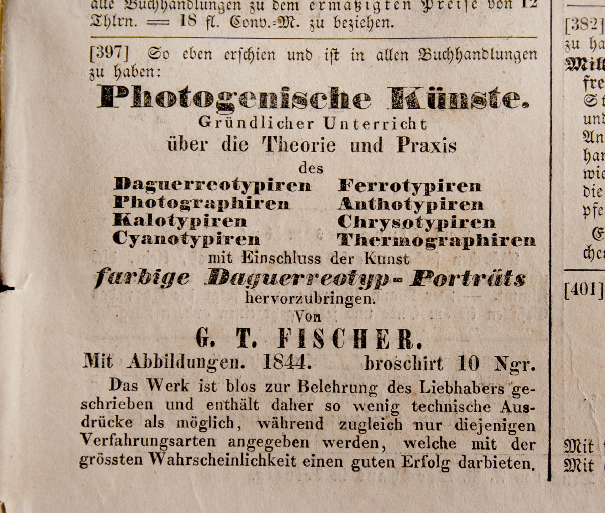 Von einem Freund bekam ich gebundene Ausgaben der "Illustrierten Zeitung" Leipzig, von 1844 geschenkt. In der Ausgabe vom 31. August 1844 ist ein Inserat für ein Anleitungsbuch aus den frühesten Jahren der Photographie zu finden:
