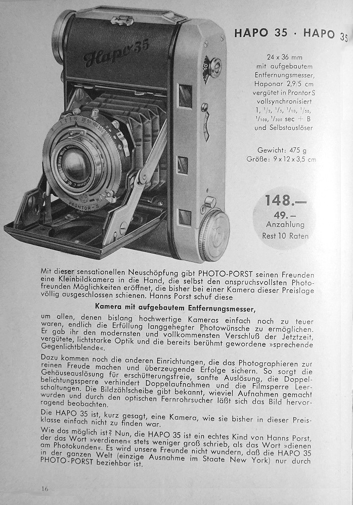 In der Hauszeitschrift "Nürnberger Phototrichter" Ausgabe 4, 1951 auf Seiten 16, 17 wird eine dieser Hausmarken vorgestellt: Die Hapo 35, eine Sucher-Kleinbild-Kamera mit integrierten Entfernungsmesser.