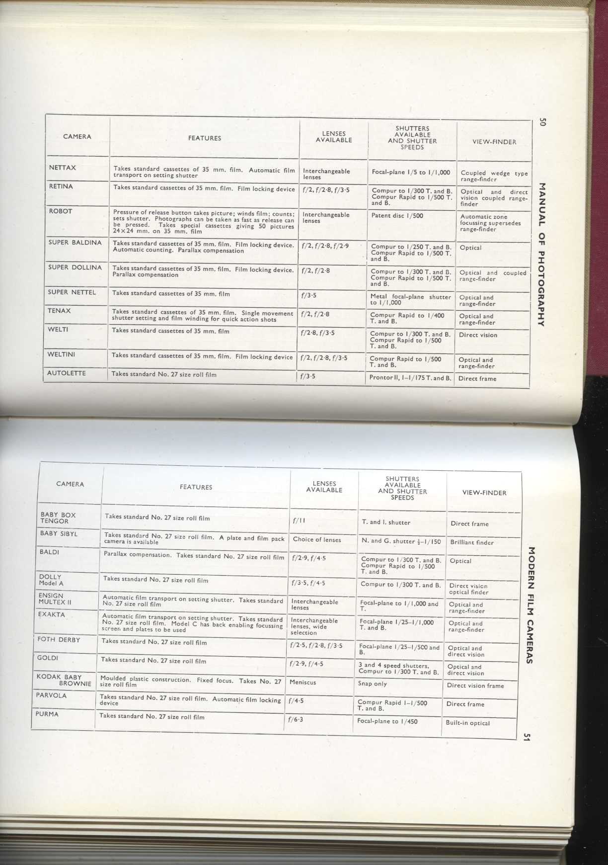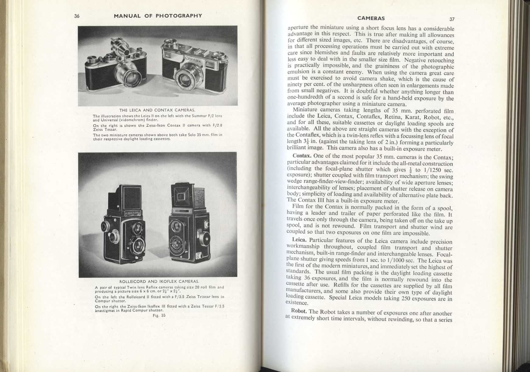 Hier die 3. Ausgabe 1944 mit Beispielen, insbesondere auch Auflistung zeitgenössischer Kameras und ihre einzelne Beschreibung in Auszügen. Das Manual ist bei archive.org auch als PDF, Epub und in weiteren Formaten frei downzuloaden ( https://archive.org/details/aa086-IlfordManualOfPhotography) , sodass ich annehme, die Beispiel-Scans verletzen nicht das Copyright.