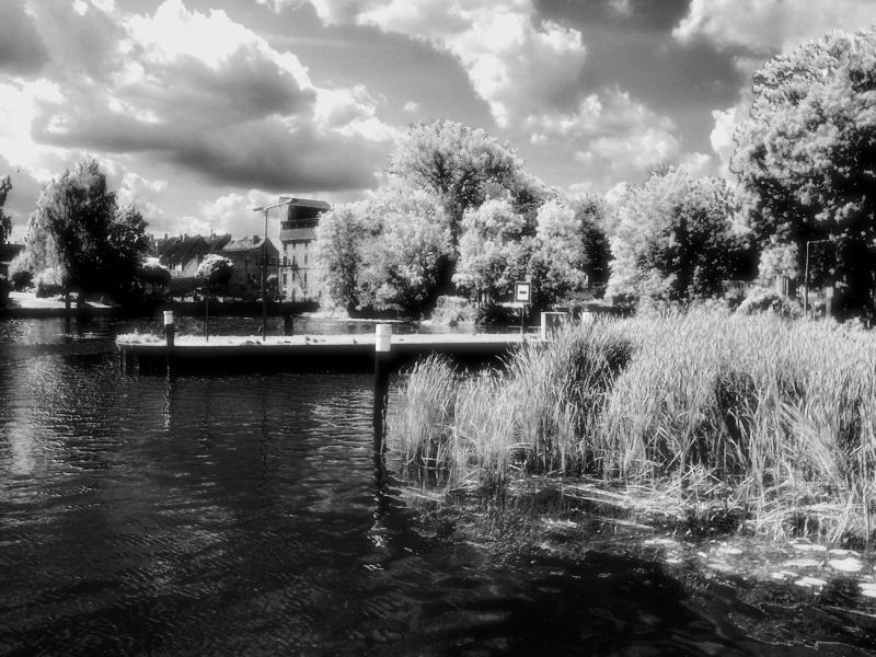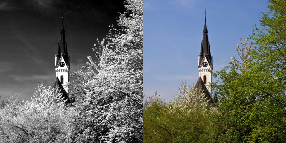 Auf diese Weise lassen sich (Pseudo)Infrarotbilder auch mit sehr kurzen Belichtungszeiten erstellen, da ja kein "Schwarzfilter" für die Aufnahme erforderlich ist. Der einzige Unterschied zu einem "echten" Infrarotbild besteht darin, dass auch grün gestrichene Objekte (z.B. eine Parkbank) ebenfalls weiß erscheinen, was in einer echten Infrarotaufnahme wegen des fehlenden Chlorophylls nicht der Fall ist.