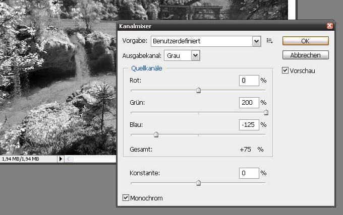 Für die extreme Aufhellung der grünen Bildteile werden nun die Schieberegler im Kanalmixer auf Rot=0%, Grün=200%, Blau=-125% eingestellt und der gewünschte Effekt ist erreicht.