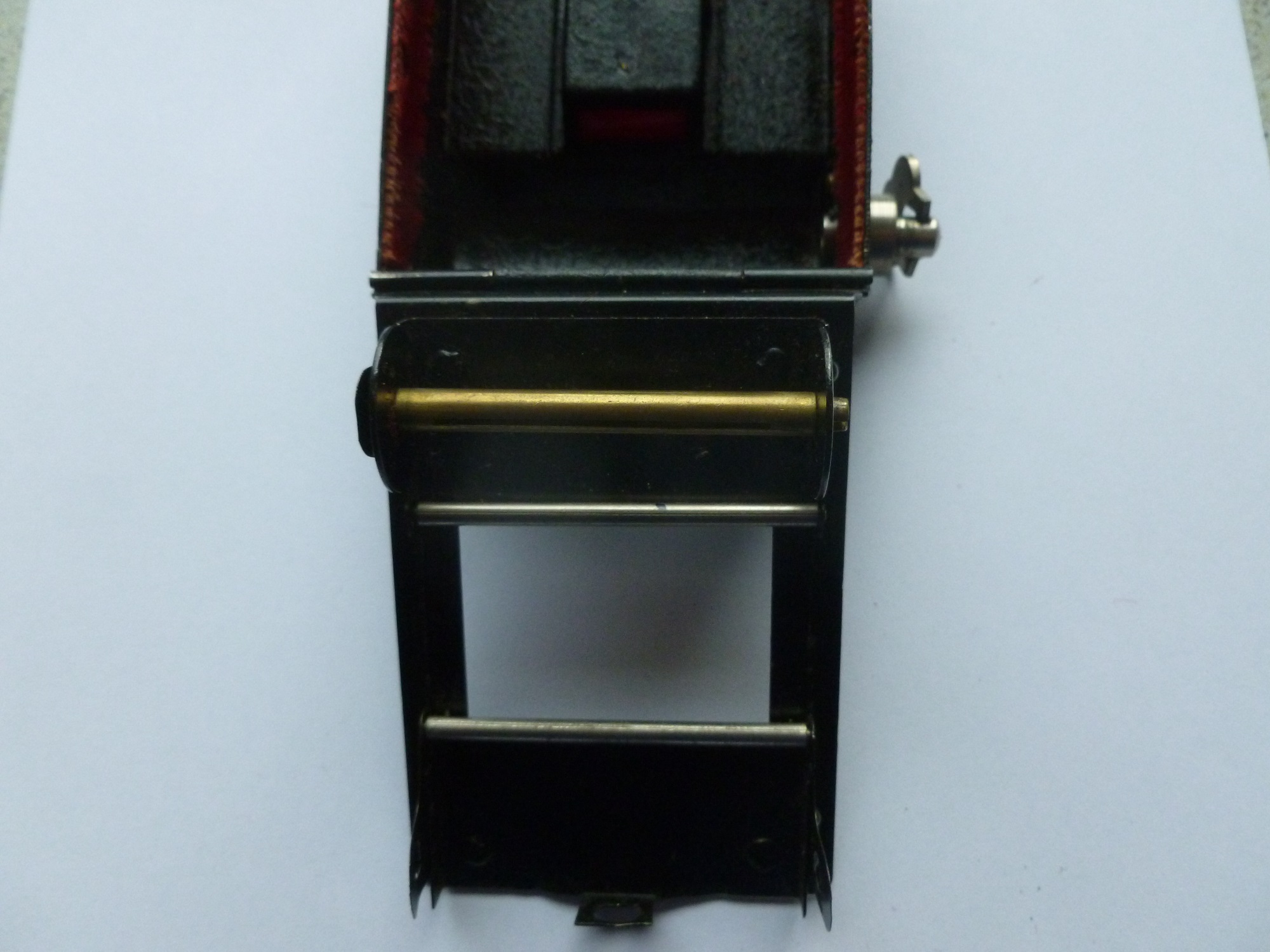 die Rollfilmrückwand ist evtl. von einem anderen Hersteller da der Lack abweicht (Rada scheidet als Produzent aus) Die Rollfilmeinheit wird nicht im Falz geführt sondern wird als Stülpdeckel aufgesetzt.