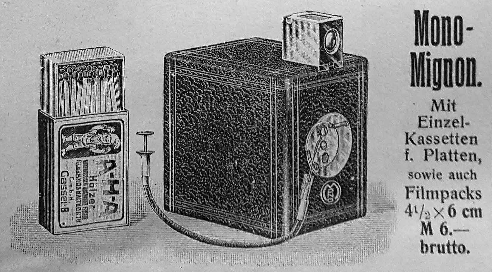 Ich habe auch mal gesucht, ob ich etwas finde, was die Kamera in Richtung Mono-Werk einordnen lässt, aber nichts wirklich Passendes gefunden. In der Zeitschrift ‚Die Photographische Industrie‘ von 1914 findet sich folgende Anzeige vom Mono-Werk: