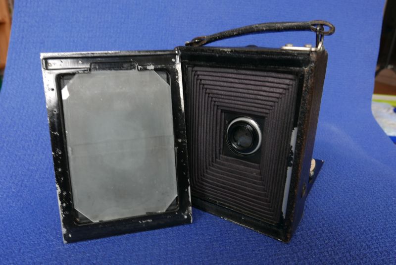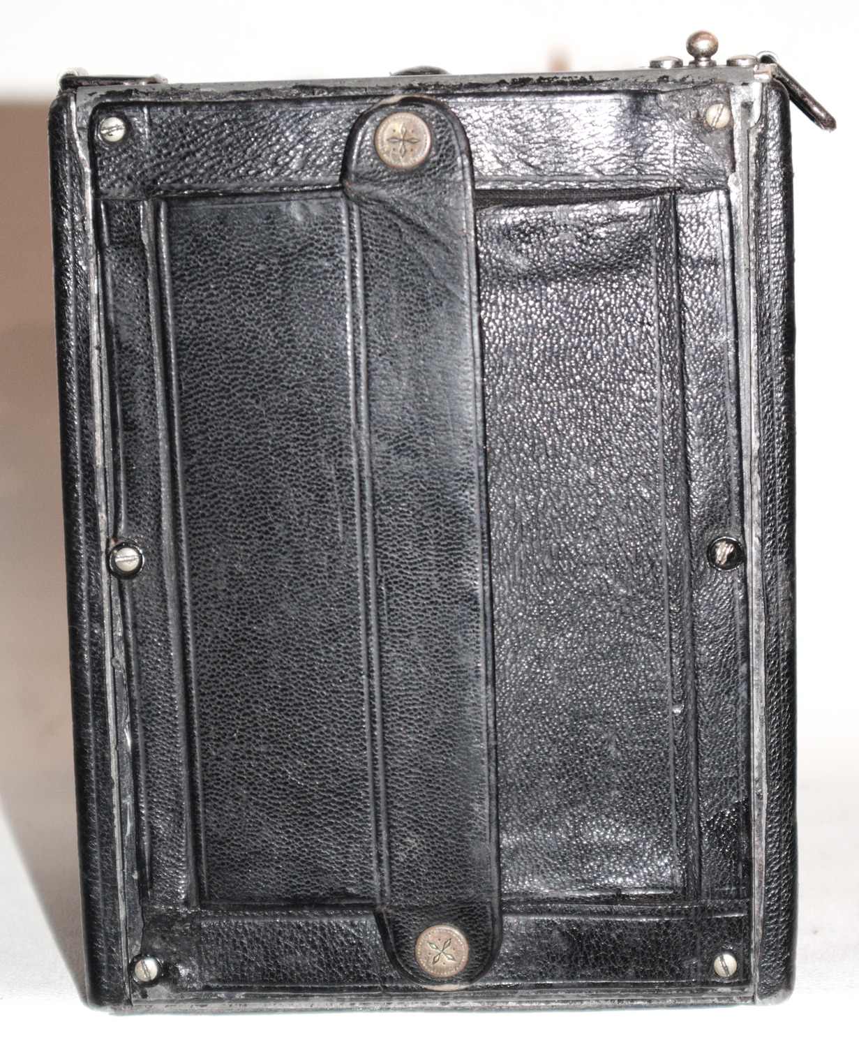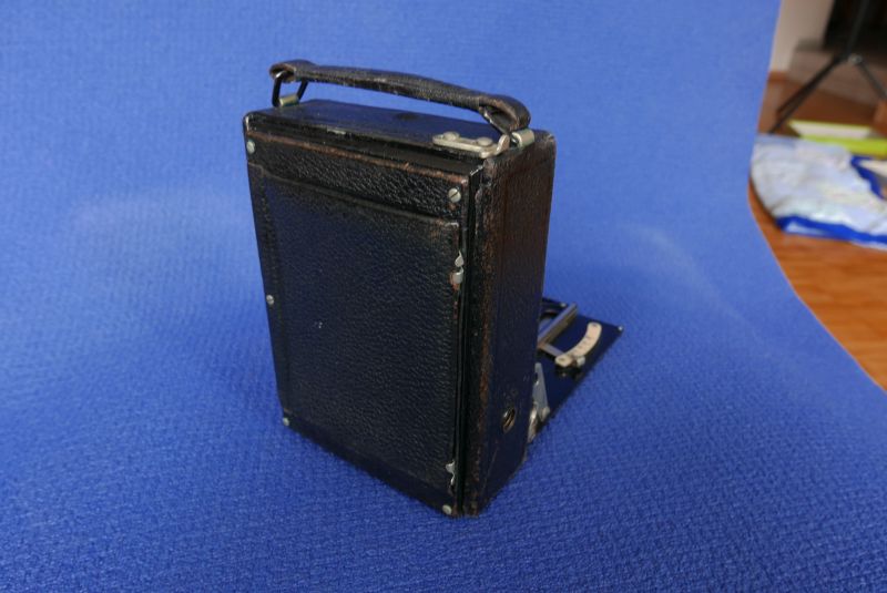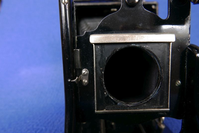 Soweit ich es erkenne, könnten ein paar dieser Details, insbesondere Knöpfe und Spreizenbefestiungen, doch meiner anderen entsprechen, die Firmenplakette im Original auch - bei meiner waren nur undefinierbare Lackreste da und der Text fast bis gar nicht lesbar. "Tip" war gerade noch erkennbar und schien schwarz auf hell zu sein.Ich gehe inzwischen eher davon aus, daß die Grundfarbe ursprünglich schwarz war. Sehr unterschiedlich ist allerdings, was sich in Deinen Bildern 2 und 3 hinter der Spreize abspielt, das ist bei meiner sehr anders und einfacher - jeweils eine rechtwinklig gebogene Feder, die bei geschlossener Kamera auf die Feder unter der Spreize einwirkt. Der Lichtschachtdeckel ist deutlich anders als bei meiner anderen: Blick von außen: Schließmechanismus auf der Rückseite ist bei meiner ein klitzekleines Hebelchen in der Mitte, und es sind nicht 6, sondern 10 Befestigungsschrauben. Blick von innen: kein Gußteil mehr, sondern in Form gedrücktes Blech nit eingenietetem Blech - Funktionalität jedoch dieselbe wie bei Deiner - also einfach das Gußteil in Blech interpretiert. Bei der hier vorgestellten war auch etwas und nur auf dieser Seite, eine auf dem Laufboden verschraubte Öse - ja, klar, das war derselbe Mechanismus wie bei Deiner, und das bei ganz anderer Spreize! Jezt weiß ich, was ihr zum Aufdrücken des Deckels beim Öffnen fehlt, zweifle aber sehr, ob ich mir's antue, das nachzubauen.