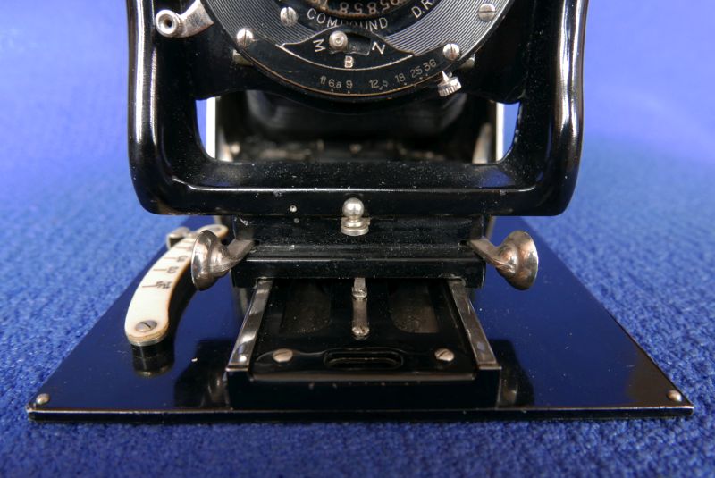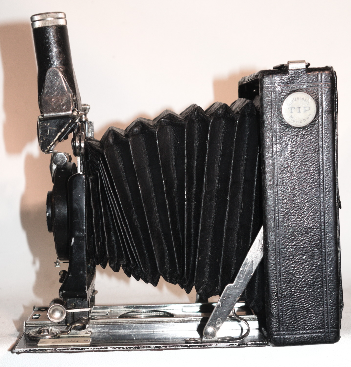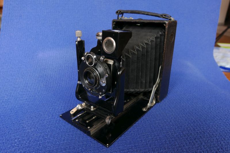 Rietzschel Tip Radial 9x12 / Nr. 1032xx / Rietzschel Doppel-Anastigmat Sextar 6,8 135mm / Compound (der Nummer nach von 1912). Ich gehe davon aus, dass sowohl Rückwand, als auch Verschluss und Objektiv original zur Kamera gehören: