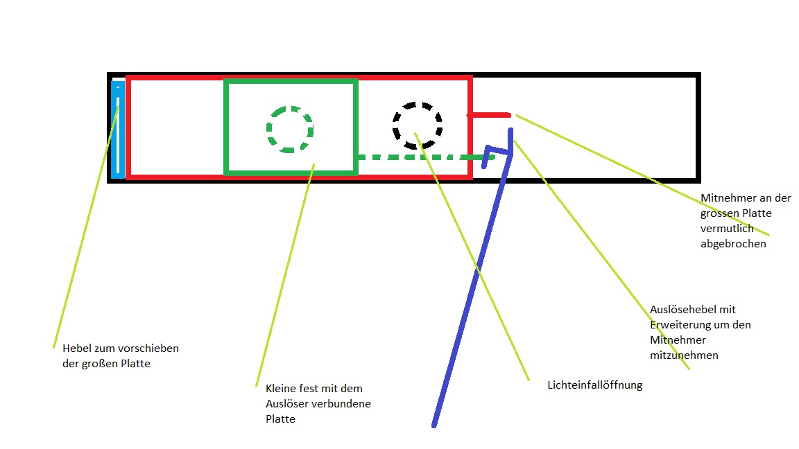 Und da hat er mir auch schon geholfen, der Mitnehmer ist das Problem, er nimmt nämlich nix mit, ich gehe davon aus das da etwas abgebrochen ist, sieht man auf den zwei Bildern recht gut: Ich nehme an da sollte eigentlich eine Art gebogenes Ende sein, so das der Auslöser es mitnehmen kann, und der ist leider weg, und ohne zu wissen wie er original ausgesehen hat, wird das wohl eher nix. Hab mal eine, hoffentlich verständliche, Grafik erstellt: Eine Vermutung ist das der abgebrochene Mitnehmer bis zum Ende der Schiene ( schwarz ) reicht, wenn die große Platte vorgeschoben ist, aber das ist reine Mutmaßung. Wobri rein Optisch, also zum hinstellen, das Fehlende Fenster schlimmer ist, aber da hab ich noch keine Ahnung wo man sowas herbekommt, oder wie man das ohne besonderes Werkzeug bastelt, hatte mir schon überlegt ne Boxkamera zu plündern aber das passt leider nix.