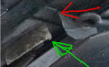 Mag sein, ich verstehe die Situation nicht. Aber für mich siet es so aus, als ob .. ... der wie erwartet ein wenig gekröpfte (grüner Pfeil) Mitnehmer an der Kante (roter Pfeil) leicht hängen sollte. Da ist aber ein riesiger Spalt dazwischen - wieso? Für mich sieht es so aus, daß irgendetwas den Mitnehmer daran hindert, näher zu kommen.