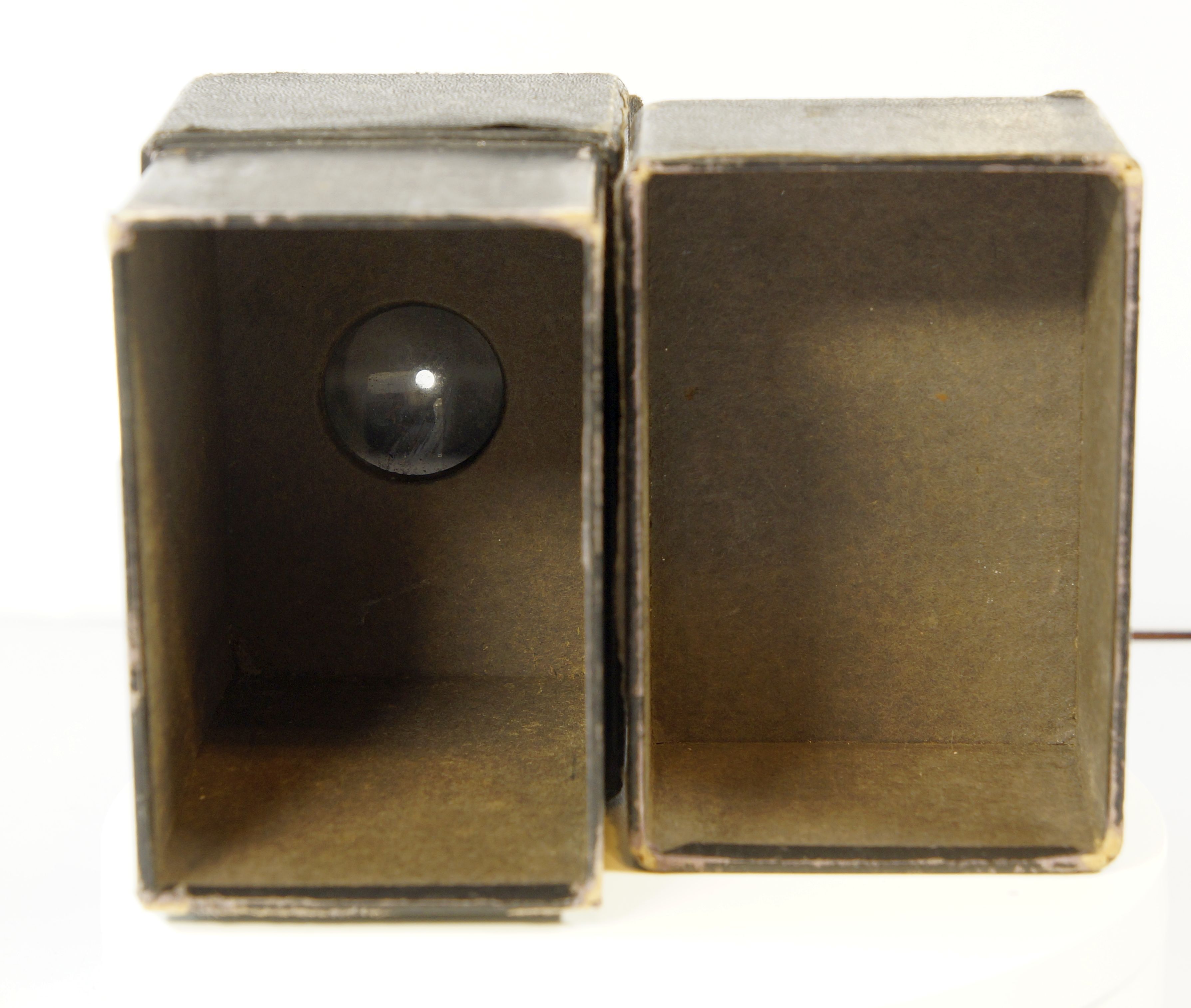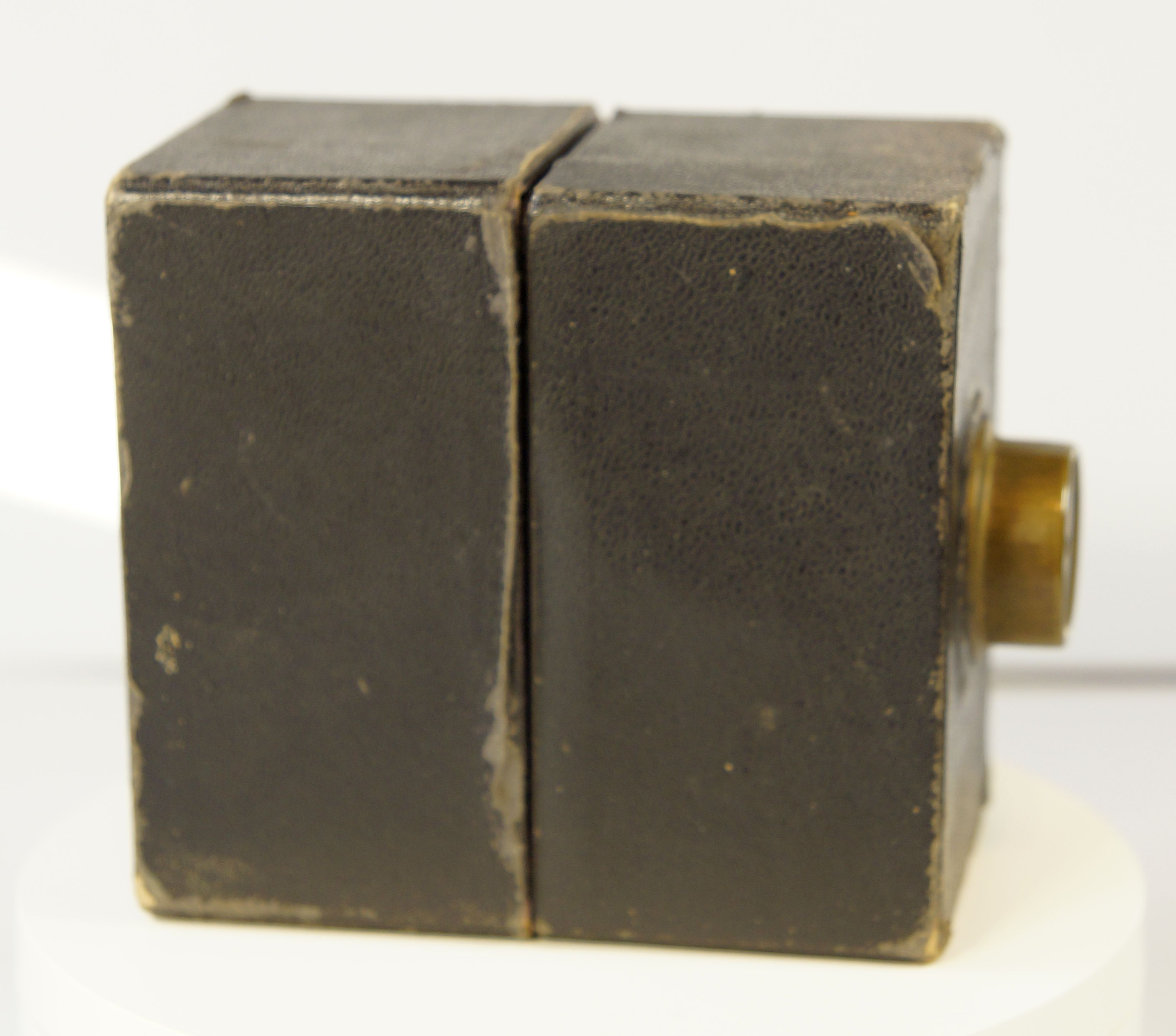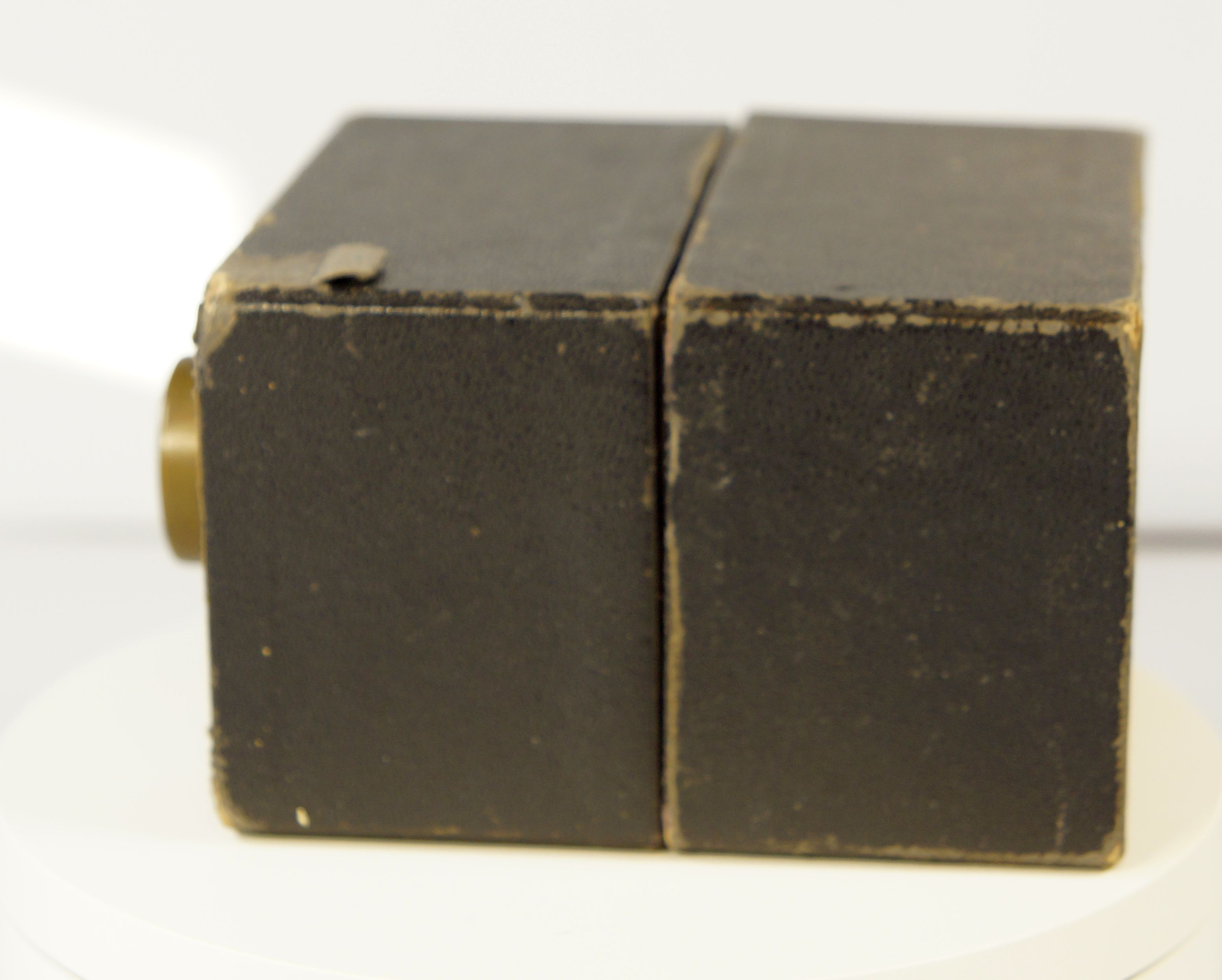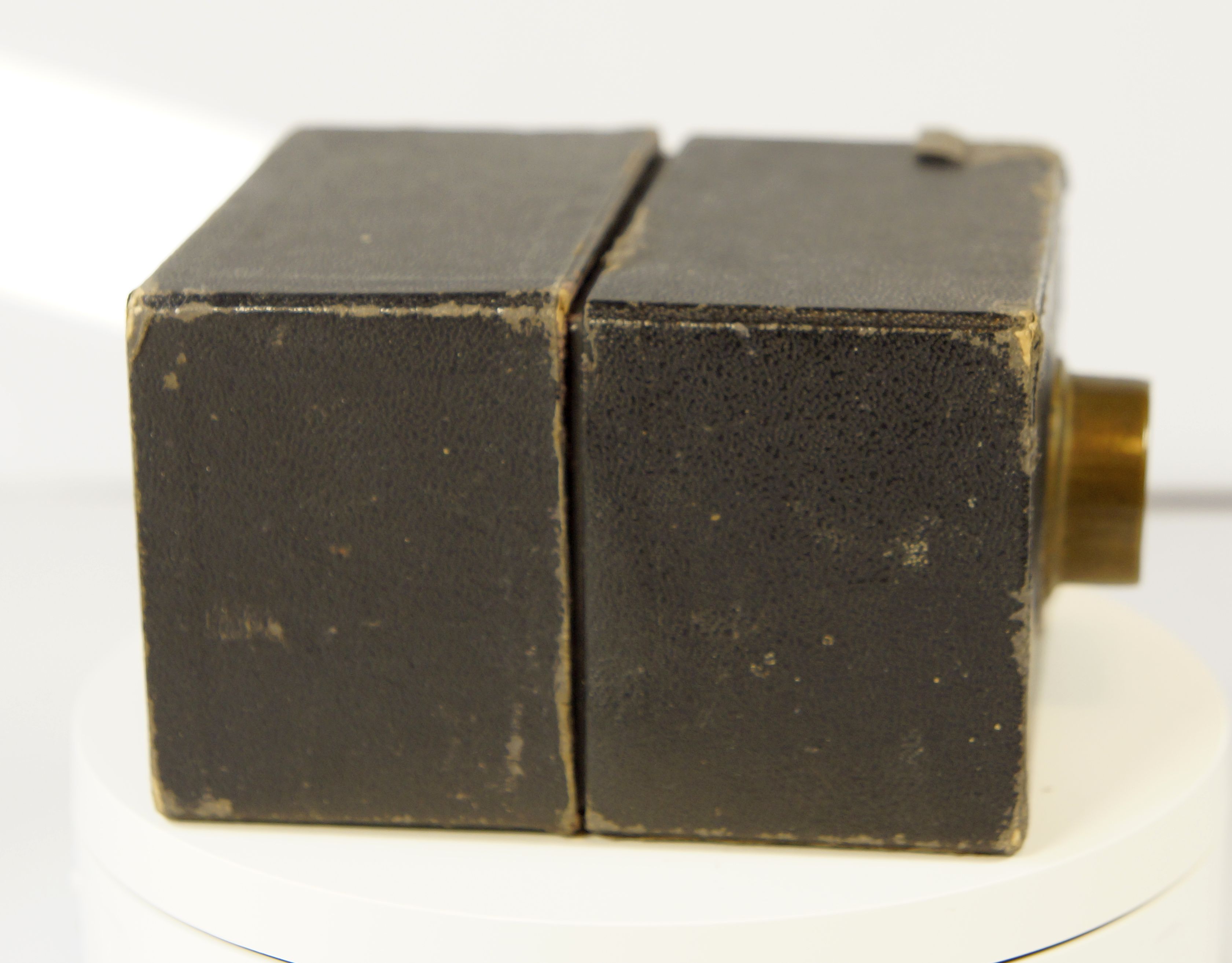 ... stelle ich natürlich auch die Kamera vor. Es Handelt sich um eine sehr einfache Box aus Pappe mit einer kleinen Glaslinse die hinter einem "Objektiv" aus Messing verborgen ist, die goldene Schrift und das Messingblech sollen vermutlich Wertigkeit anzeigen.