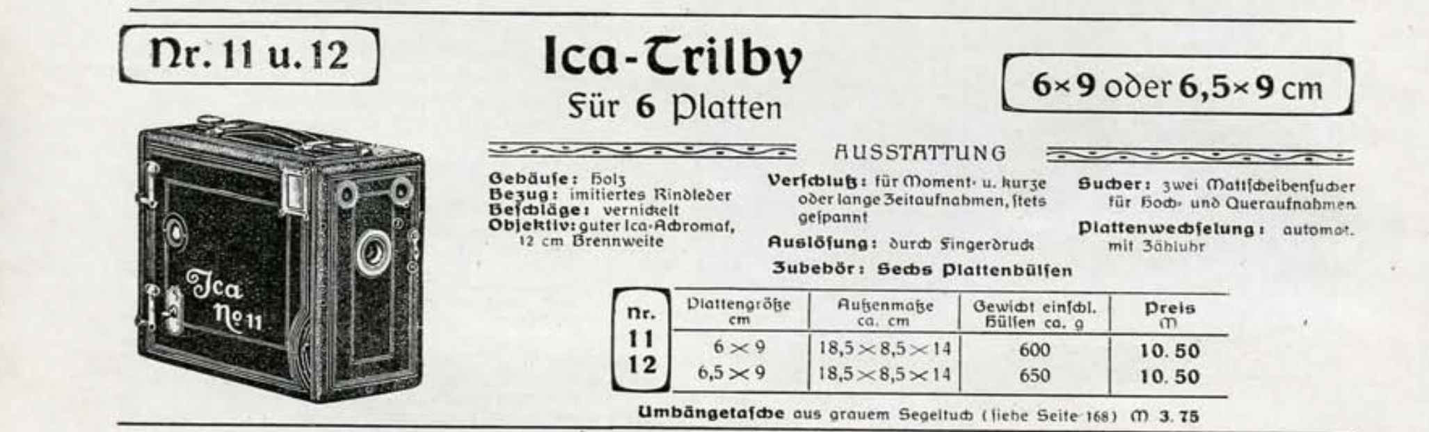 Zum Format: Angeboten wurden die Schwestermodelle Trilby 11 und 12, die sich nur minimal im Format unterscheiden: Während das Modell 11 für Platten 6x9 vorgesehen ist, nimmt Modell 12 die üblichen Platten im Format 6,5x9 auf. Mir war bislang gar nicht klar, dass es Platten in 6x9 gab – ich habe das immer für ein Filmpackformat gehalten. Die beiden Modelle unterscheiden sich in den Abmessungen, nicht; Aufschluss gibt nur die Größe der Plattenhülsen. Hier ein Ausschnitt aus dem Ica-Katalog 1912/12 (S. 2).