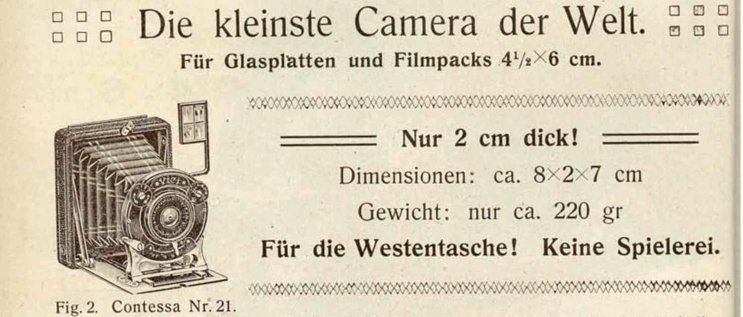 Ja, diese Haltung kommt auch in vielen Fotolehrbüchern der Zeit zum Ausdruck – 9x12 als Universalformat für den Amateur, größere Formate für professionelle Zwecke – und 6,5x9 wird allenfalls für Wanderungen und auf Reisen empfohlen. Da hat man dann das 'Westentaschenformat' 4,5x6 erst recht nicht für voll genommen – kein Wunder, dass in Anzeigen und Katalogen ausdrücklich betont werden musste, dass es "keine Spielerei" sei