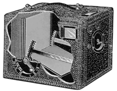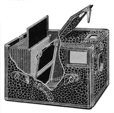 1) Adlake Repeater: Rapid action magazine camera. Kann 12 Platten belichten ohne die Box zu öffnen. 12 Aufnahmen in 10 Sekunden möglich. Keine Entnahme bei Tageslicht von einzelnen Platten möglich.