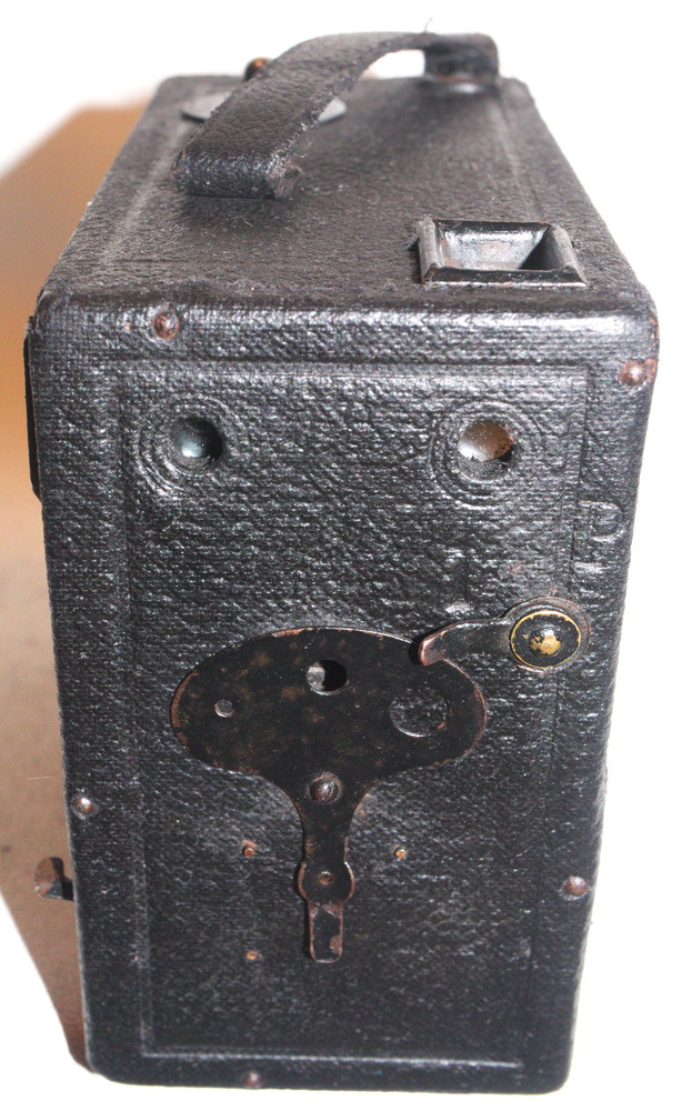 Das Gehäuse ist aus einfachem Holz, genagelt, die vernickelte Betätigung des Fallmechanismus und damit auch des Bildzählwerks ist auf der rechten Seite hinten. Die linke Gehäuseseite ist leer.