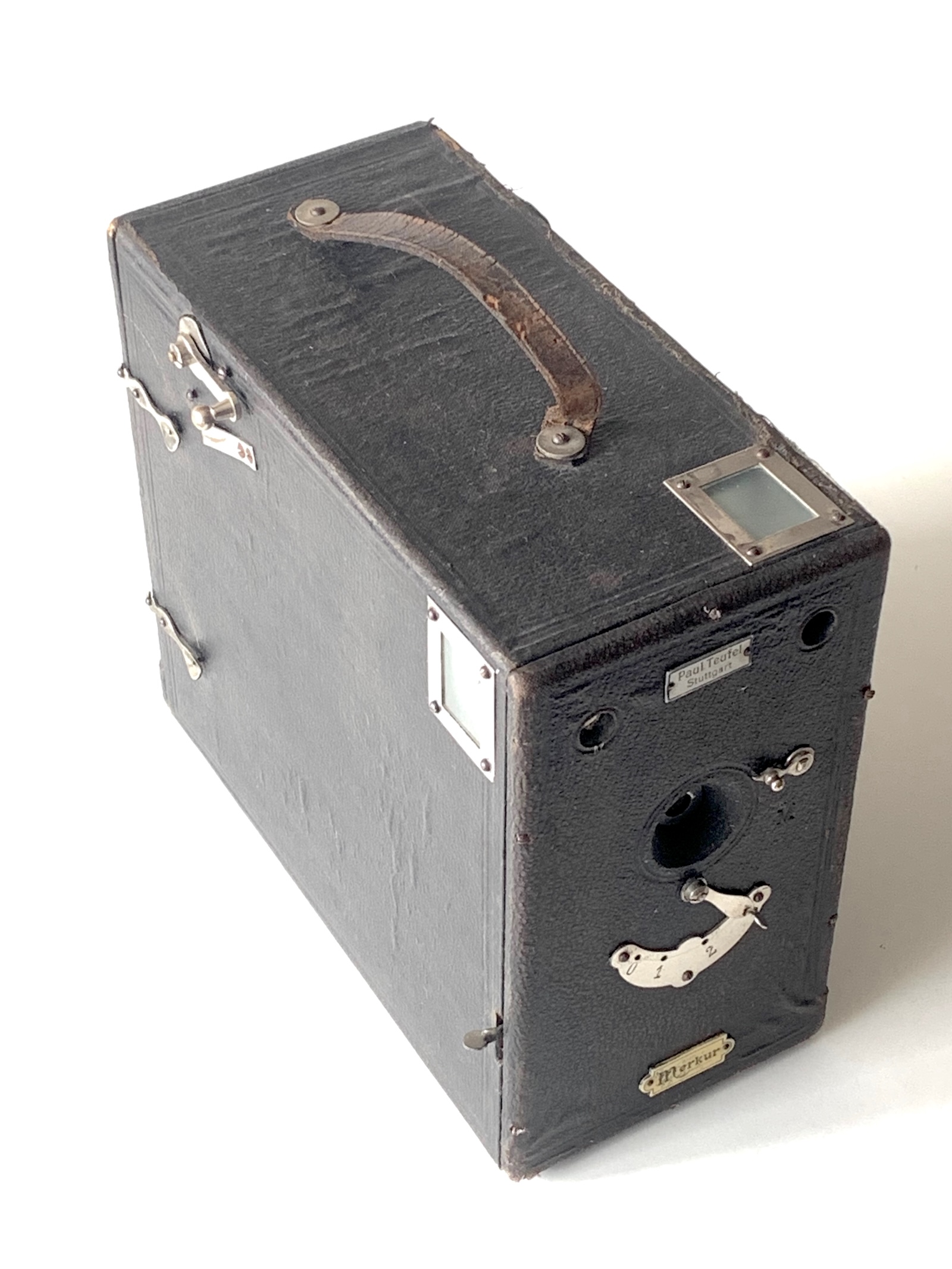 Die als Merkur bezeichnete Kamera ohne Herstellerangabe lässt sich problemlos der Fa. Richard Hüttig (Dresden) zuordnen, auch wenn das Firmenemblem (Pentagramm) fehlt. Es handelt sich um eine Magazinkamera mit Wechselmechanismus für Platten 9x12. Die Ausstattung ist vergleichsweise schlicht: Das Objektiv ist eine unbezeichnete Landschaftslinse, der Schleuderverschluss liefert eine M[omentzeit] und Z[eit]. Mit dem großen Regler auf der Frontseite lassen sich drei Lochblenden einschwenken bzw. die Objektivöffnung ganz verschließen. Zur Motivbetrachtung dienen zwei boxtypische Mattscheibensucher. Der Wechselmechanismus wird betätigt, indem die Kurbel um 90° entgegen dem Uhrzeigersinn gedreht und wieder zurückgestellt wird; die Arretierung erfolgt etwas rustikal über einen Blechstreifen.