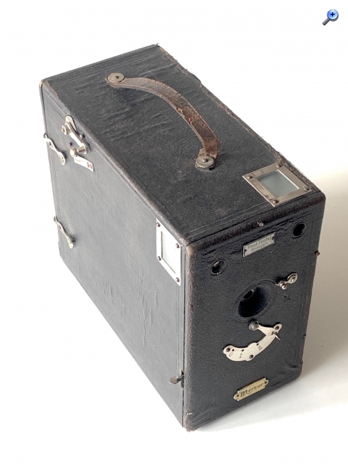 Die Kamera nimmt 12 Platten auf, die in Plattenhülsen zu stecken sind. Eine „Zähluhr“ – so hieß das seinerzeit in den Prospekten – sucht man vergebens; man musste sich also merken, wie viele Platten bereits belichtet waren. Das Holzgehäuse ist mit einem simplen Kalikobezug verkleidet.