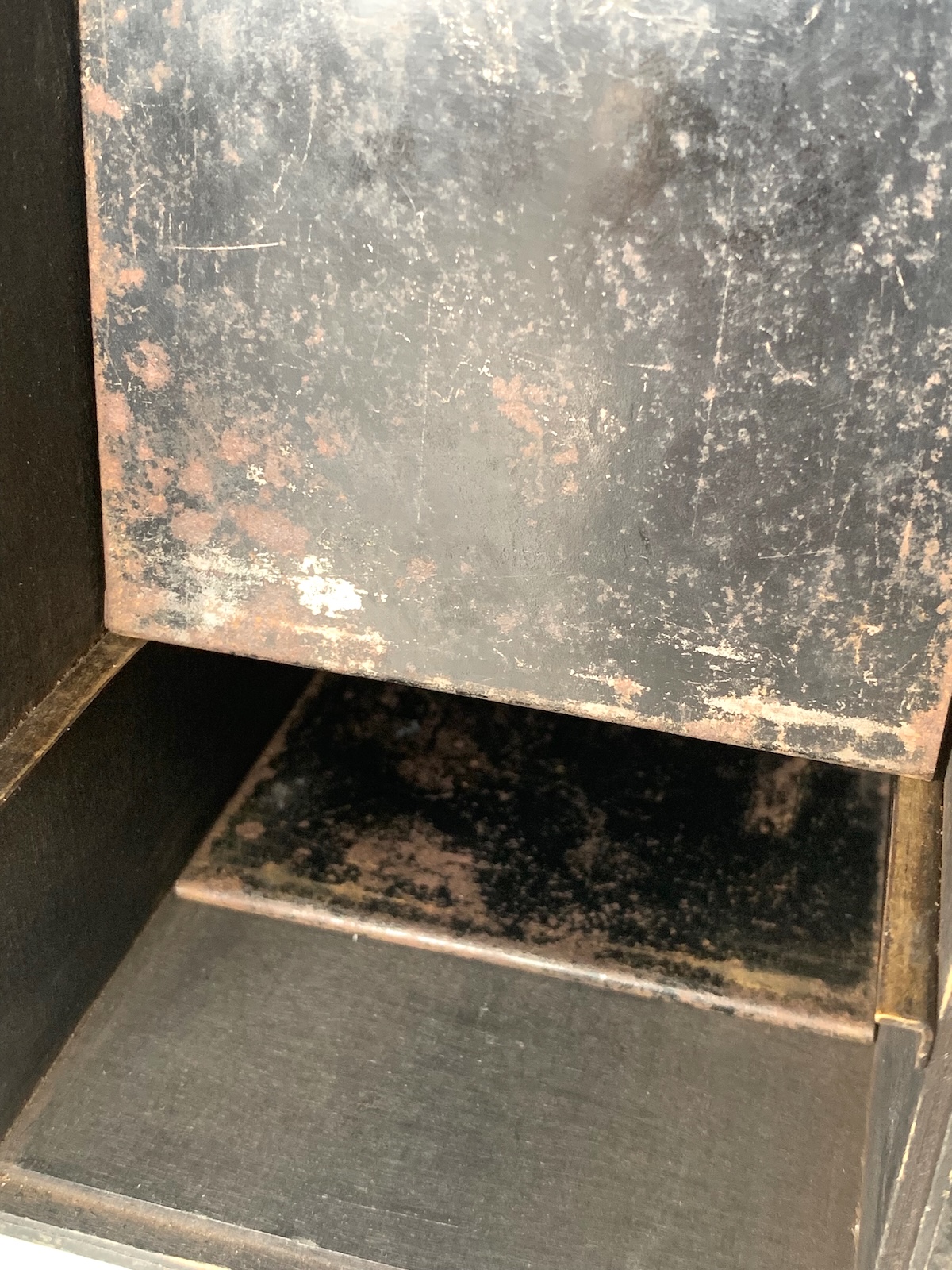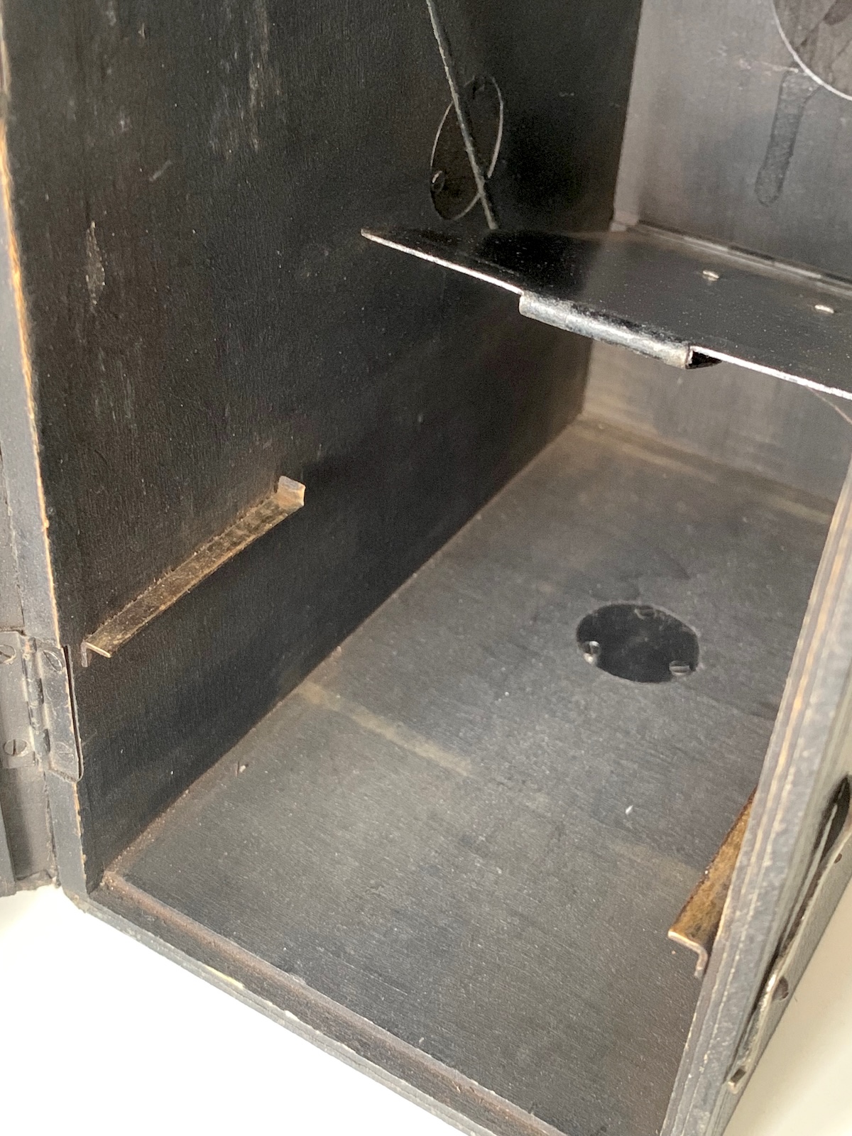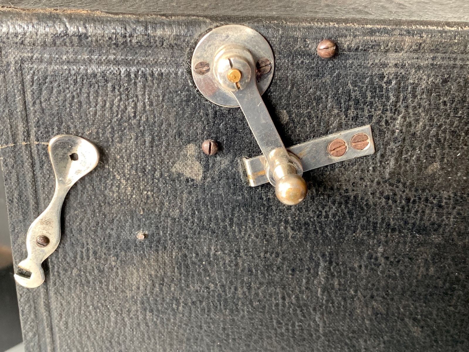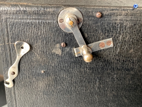Das funktioniert aber noch heute einwandfrei. Mit der Kurbel wid die horizontal liegende Platte senkrecht vor das Objektiv gebracht; sie nimmt die direkt davor liegende Plattenhülse mit, die dann auf den Boden des Kameragehäuses fällt.