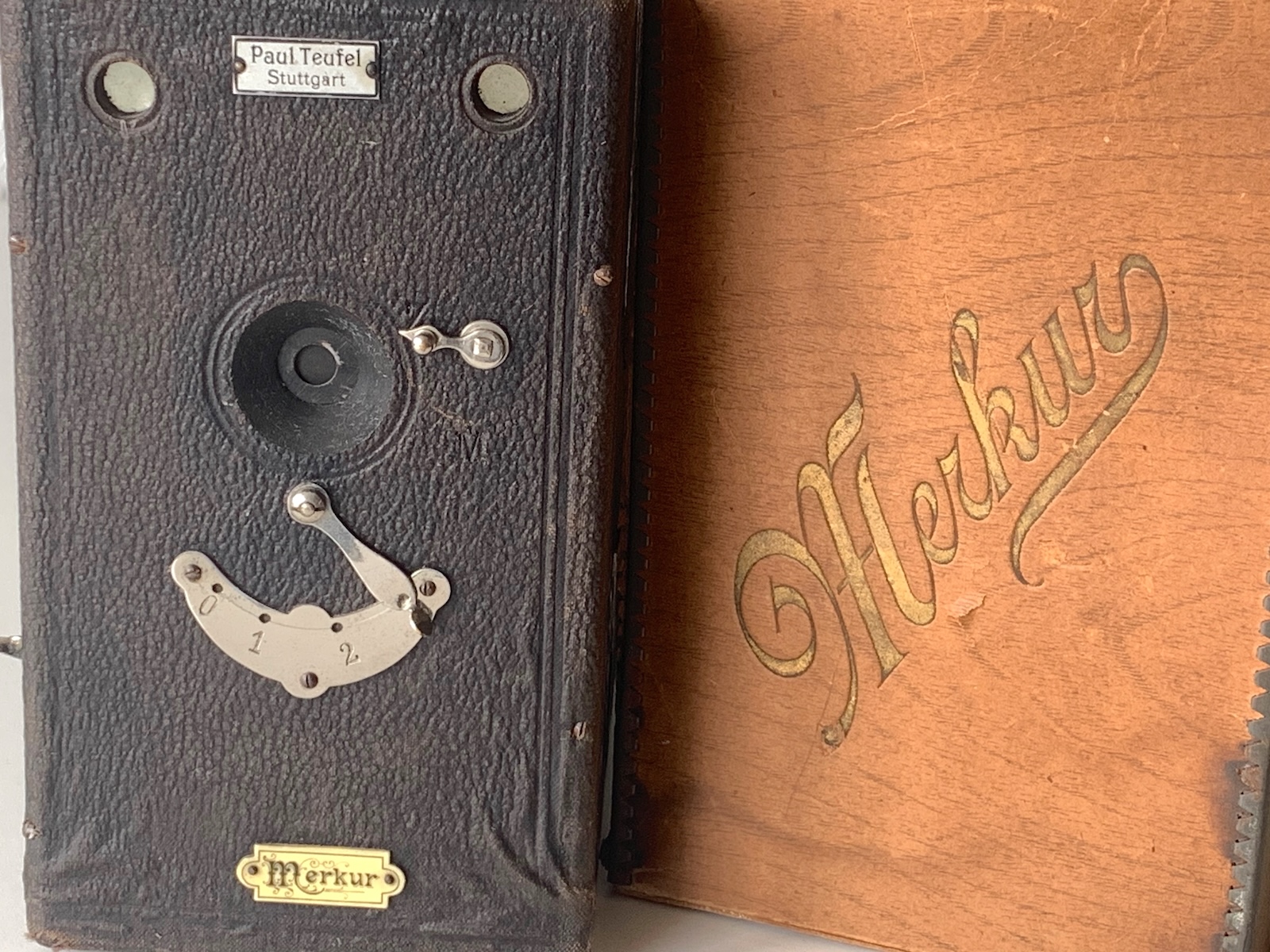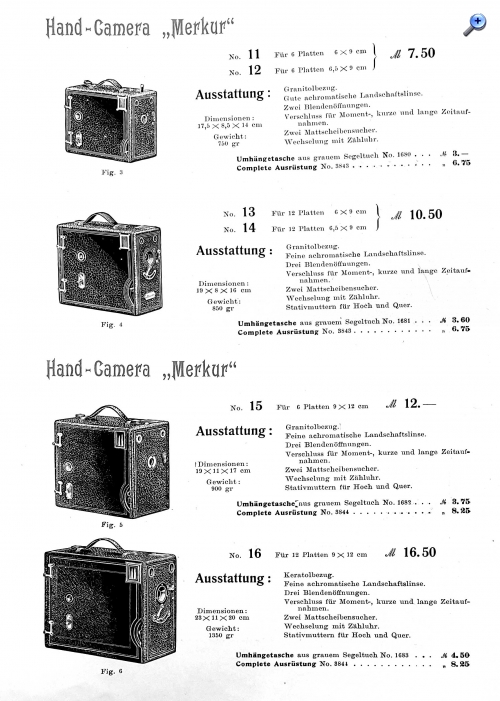 Genau zuordnen kann ich die Merkur nicht, aber trotzdem ein paar Ergänzungen geben. Die Merkur bot Hüttig spätestens ab 1896 an. Den Wechselmechanismus mit Kurbel gab es maximal bis 1902 und auch der herausstehende Auslöser wurde ab 1903 tiefer ins Gehäuse gesetzt. Das hier gezeigte Exemplar muss also vor 1903 datieren.