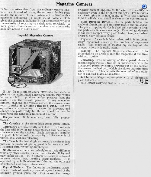 Abweichend von den Studiokameras in Kastenform, gab es aber schon bald im 19. Jahrhundert Plattenboxen für den den portablen Betrieb. Hier wurde auf die wechselbare Mattscheibe verzichtet und stattdessen eine "Zielvorrichtung" zur ungefähren Motiv-Wahl eingebaut.