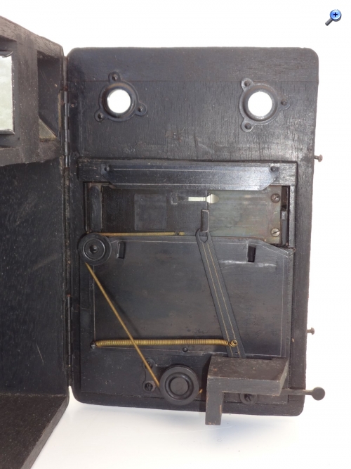 Nach der Belichtung ließ man diese Platte mittels Hebel nach unten fallen und somit die nächste Platte per Federkraft an die Position der vorigen geraten. Entnahme der Platten wieder in der Dunkelkammer.