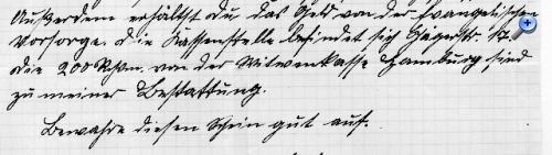 Hier ein Ausschnitt aus einem Testament meiner Großmutter mütterlicherseits von 1936. Der Text lautet: "Außerdem erhältst Du das Geld von der Evangelischen Vorsorge. Die Kassenstelle befindet sich Jägerstr. 17. Die 200 Reichsm. von der Witwenkasse Hamburg sind zu meiner Bestattung. Bewahre diesen Schein gut auf". Die Verfasserin (geb. 1874) hat die Schule besucht, längst bevor die Kurrentschrift zur Sütterlinschrift weiterentwickelt war. Wir sehen, daß hier die Unter- und Oberlängen wesentlich stärker betont sind, sodaß die Schreiberin auch darauf verzichtet hat, nach dem "d" ohne Absetzen weiterzuschreiben. Wie man sieht, laufen auch die Unterlängen in die nächste Zeile, was das Entziffern des hier als "Jägerstraße" transkribierten Wortes schwerer machte.
