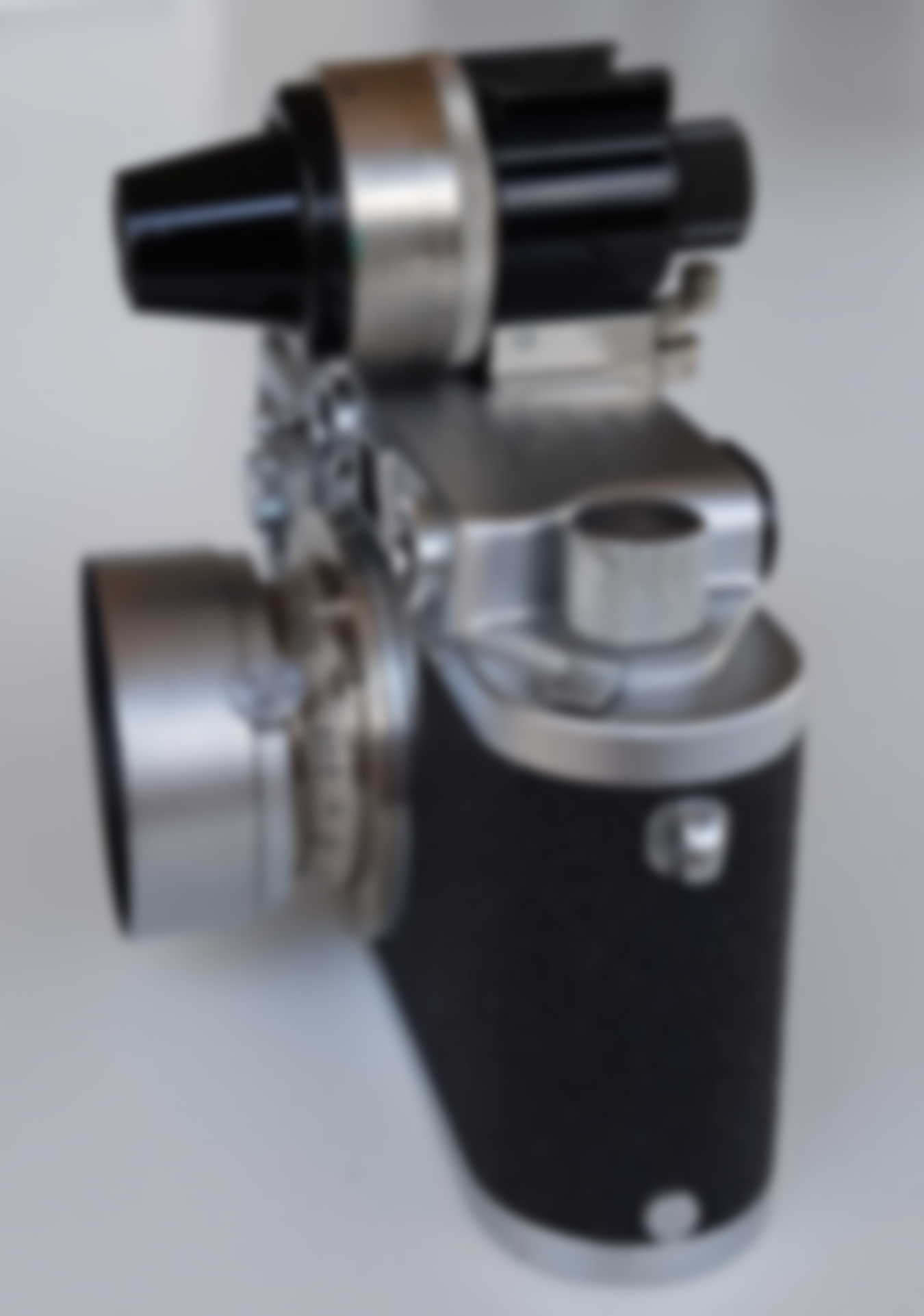 Moin, sieht das Teil nicht ein wenig kegelförmig aus, etwa wie die Leica Sonnenblende IROAA? Vielleicht etwas wie die Leica-12521-G-Sonnenblende, derzeit unter https://shop.fotohaus.ch/Leica-12521-G-S...er-50mm/SW13511 angeboten? Aufgesetzt auf ein eingefahrenes Elmar oder Industar? Mir scheint nämlich der geniale Tasthebel für die Entfernung auch auszumachen sein, und der sitzt in eingefahrenem Zustand oben, genau wie einer der Knubbel auf dem Foto.