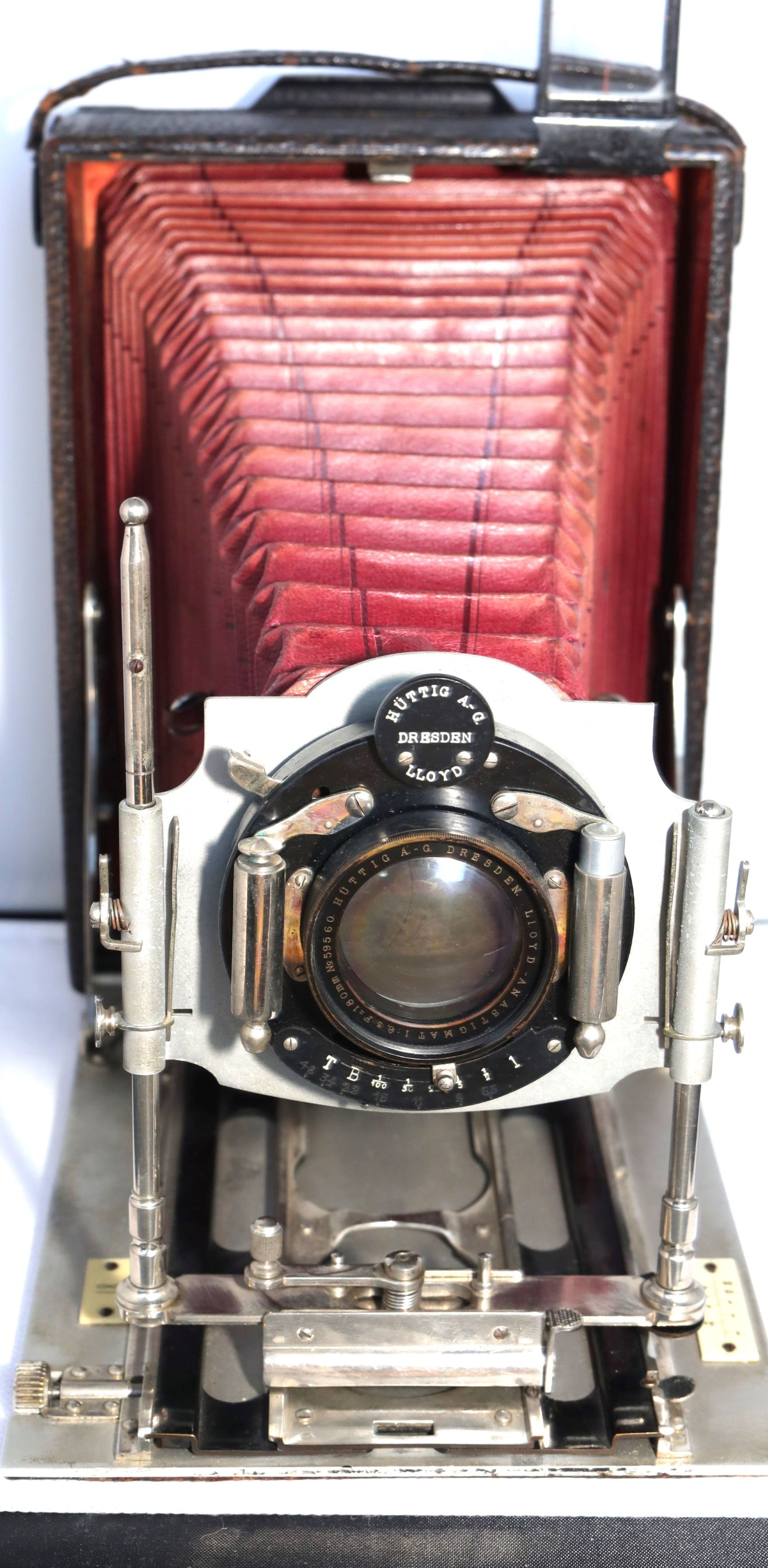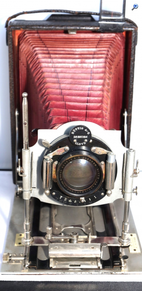 irifue:Beim Weiterblättern entdeckte ich eine Abbildung der Hüttig Ideal Plattenkamera 13x18, die der meinen recht ähnlich ist. Das Objektivbrett ist anders gestaltet.