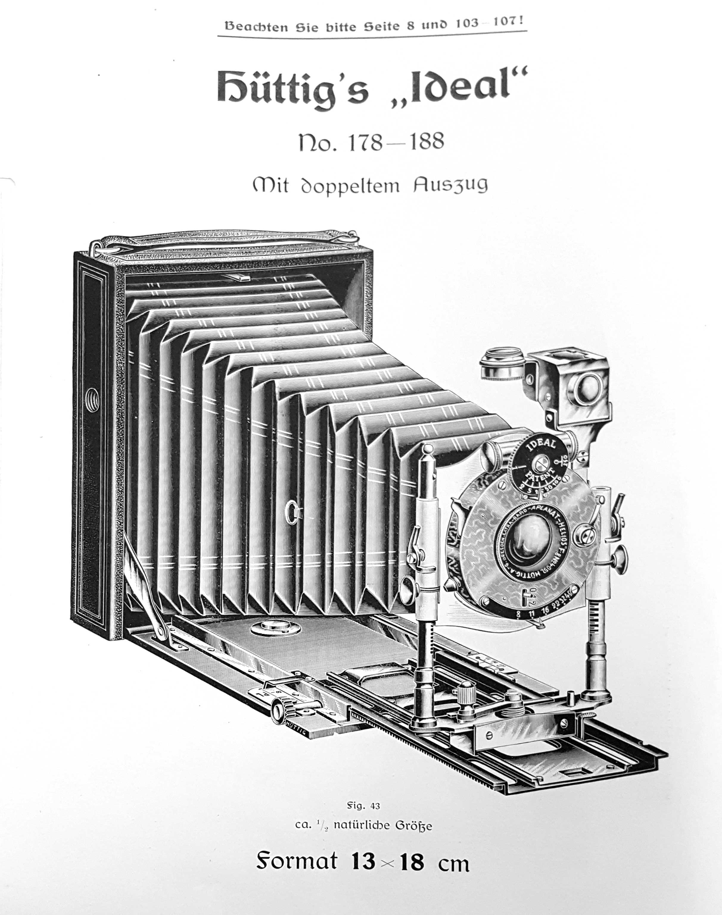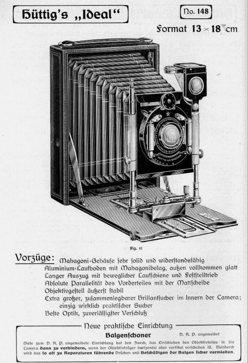 Beim Weiterblättern entdeckte ich eine Abbildung der Hüttig Ideal Plattenkamera 13x18, die der meinen recht ähnlich ist. Das Objektivbrett ist anders gestaltet.