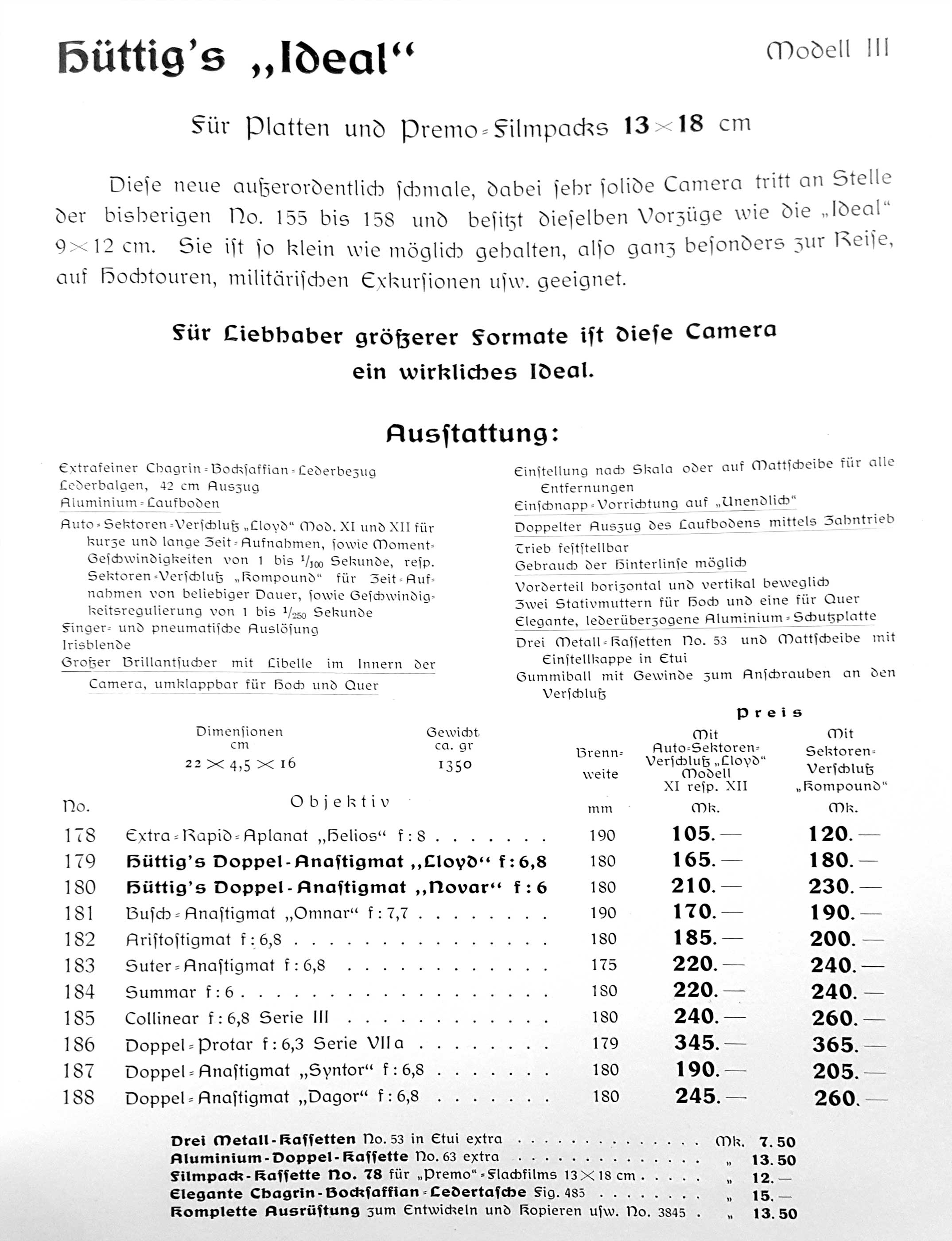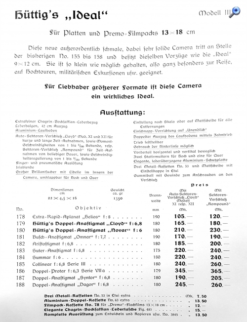 die Modellbezeichnung lautet laut Katalog "Ideal 13x18 Modell III No. 179 (mit Lloyd-Verschluss)" und das Jahr 1906 sollte zur genauen Spezifikation mit angegeben werden. Der Lloyd-Anastigmat wird im Katalog allerdings mit F:6.8 angegeben. Bei Deiner Kamera lese ich f:6.5 - vielleicht wurde da im Laufe des Jahres 1906 nochmal auf etwas lichtstärkere Optik gewechselt.
