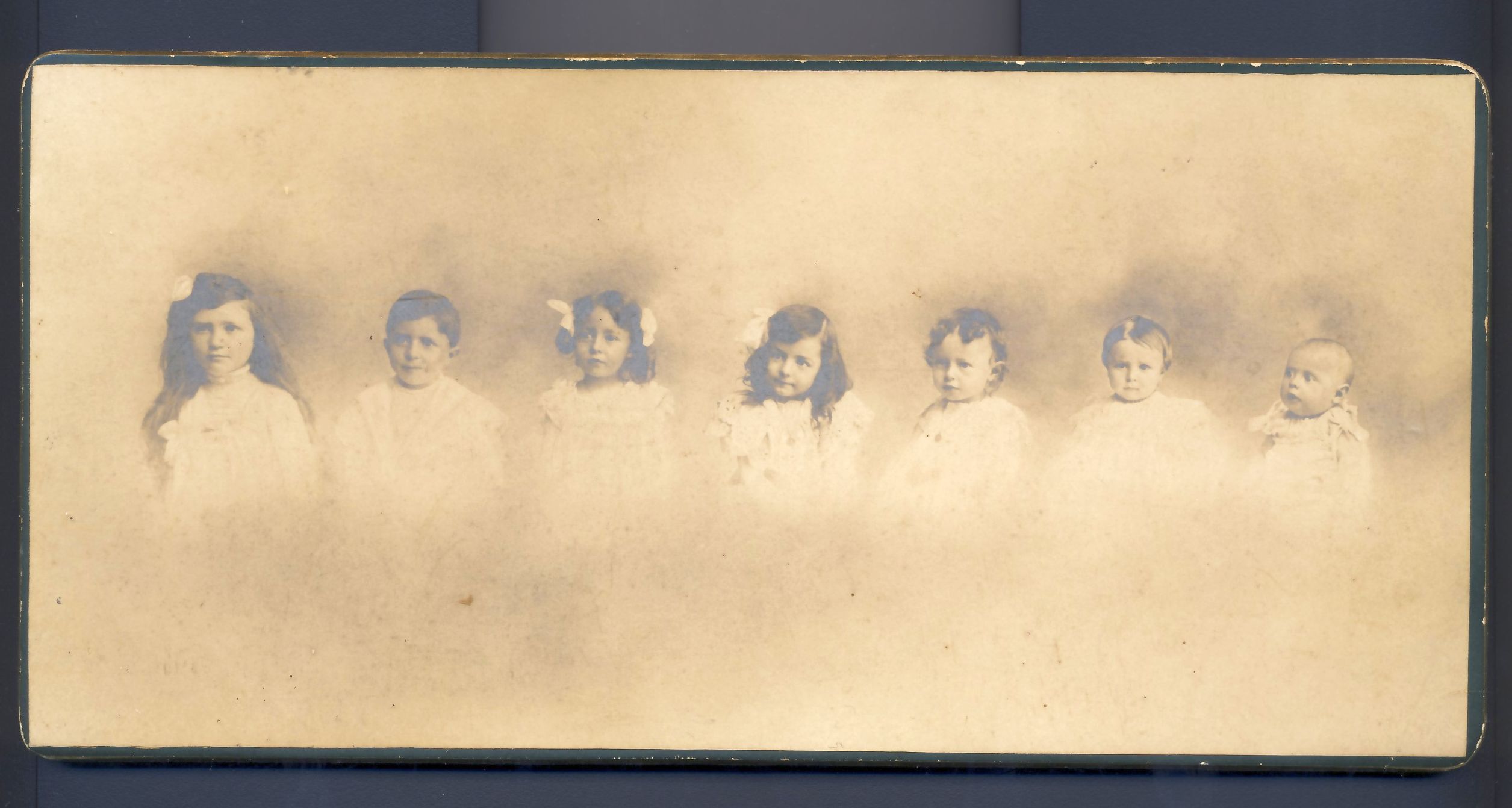 Auch das Motiv ist speziell, nämlich eine Fotomontage bei der denke ich. Die Portraits der Kinder dem Alter nach, nebeneinander gebastelt wurden, was für die Zeit wohl schon als Montage gelten kann, den Text auf der Rückseite kann ich leider nicht entziffern. Die Aufnahme kommt aus Frankreich.