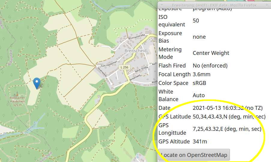 Auswertung? Wer mit "GPS Latitude 50deg 34' 43.397" "in den Exif-Daten, die vermutlich heutzutage jedes Bildanzeigeprogramm ausgibt, nichts anfangen kann , hat viele Möglichkeiten, sich den Standpunkt anzeigen zu lassen. Der Browser Firefox mit dem Add-on "wxIF" beispielsweise ruft auf Klick OpenStreetMap auf und markiert, wo man gewesen ist: