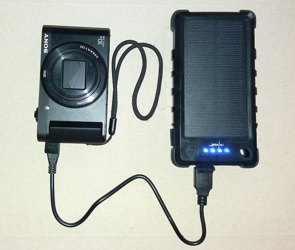 ich hatte gestern die fast leere Powerbank in zumeist voller Sonne (ca 8:00 - 20 Uhr) aufgeladen und dann die Sony HX-90 geladen. Die Kamera hat einen 1240 mAh Akku. Das Aufladen dauerte ca 5 Stunden. Die Powerbank zeigte zuerst 2 der 4 LEDs dann nur eine, bekam aber die Kamera voll. Garnicht schlecht.