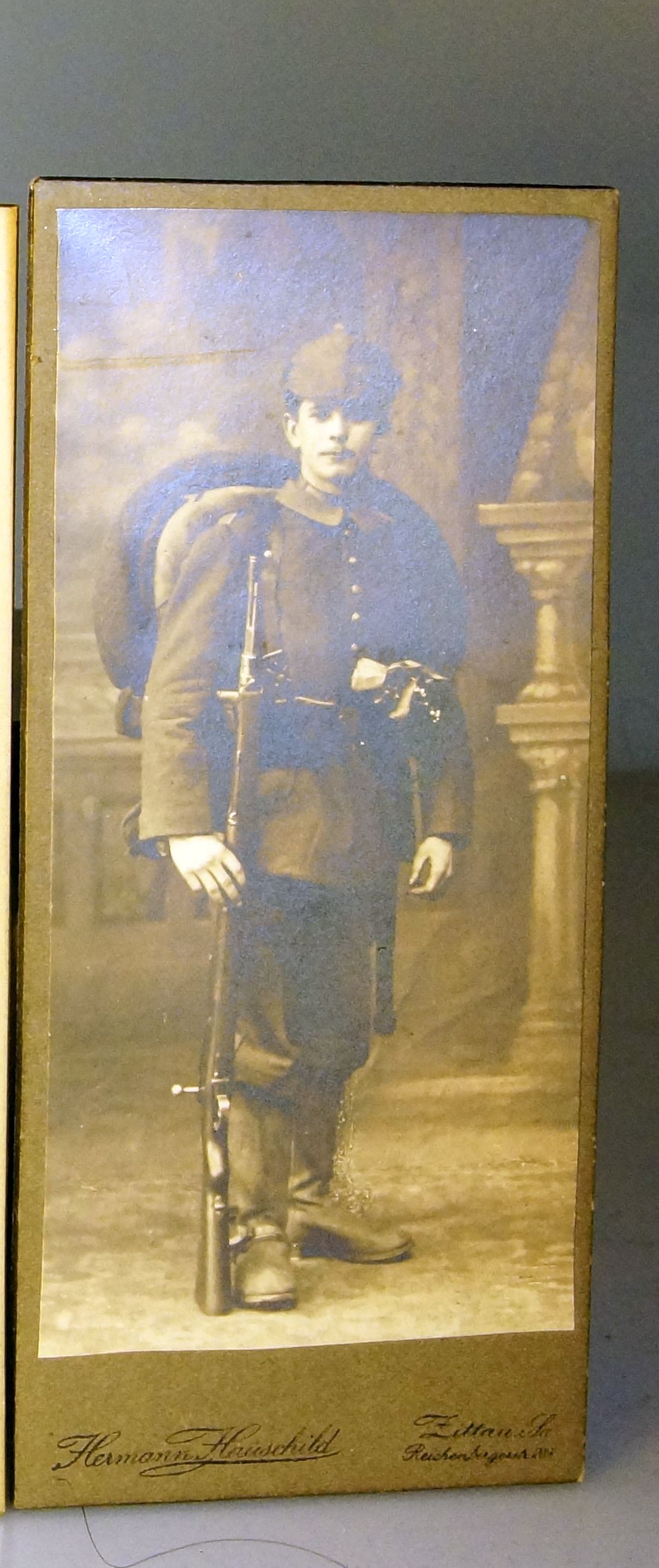 Hallo, Rainer die Frage war nicht ob alle Bilder in mein Album gehören, ohne Beschriftung werde ich das wohl nie rausfinden, ich wolle wissen ob es neben dem Format noch andere unterschiede zwischen Kabinett und CDV Bildern gibt, vom Format her sind meine wohl alle CDV ich habe jetzt eben nur in der Größe passende Bilder reingemacht, und auch nur eines pro Seite so das man den Rücken, und damit die Beschriftung des Fotografen erkennen kann, die restlichen Bilder werde ich anderswo lagern. SO aber nu zu Bildern ;-), angefangen hat alles damit das ich ein Set zum colorieren von Bildern erworben habe, danach habe ich nach einem Beispiel gesucht wie man damals damit Bilder verhunzt hat, sorry anders kann man es meist nicht sagen, und ein eben solches war in dem Album, auf dem letzten Bild sieht man ungefähr den vergleich zwischen Bildern die ins Album passen und solchen die zu lange sind, das Bild mit dem Soldaten ist das einzige das sich Zeitlich zuordnen lässt, allerdings kann ich ausser 1918 nicht viel lesen, Sütterlin kann ich nicht.