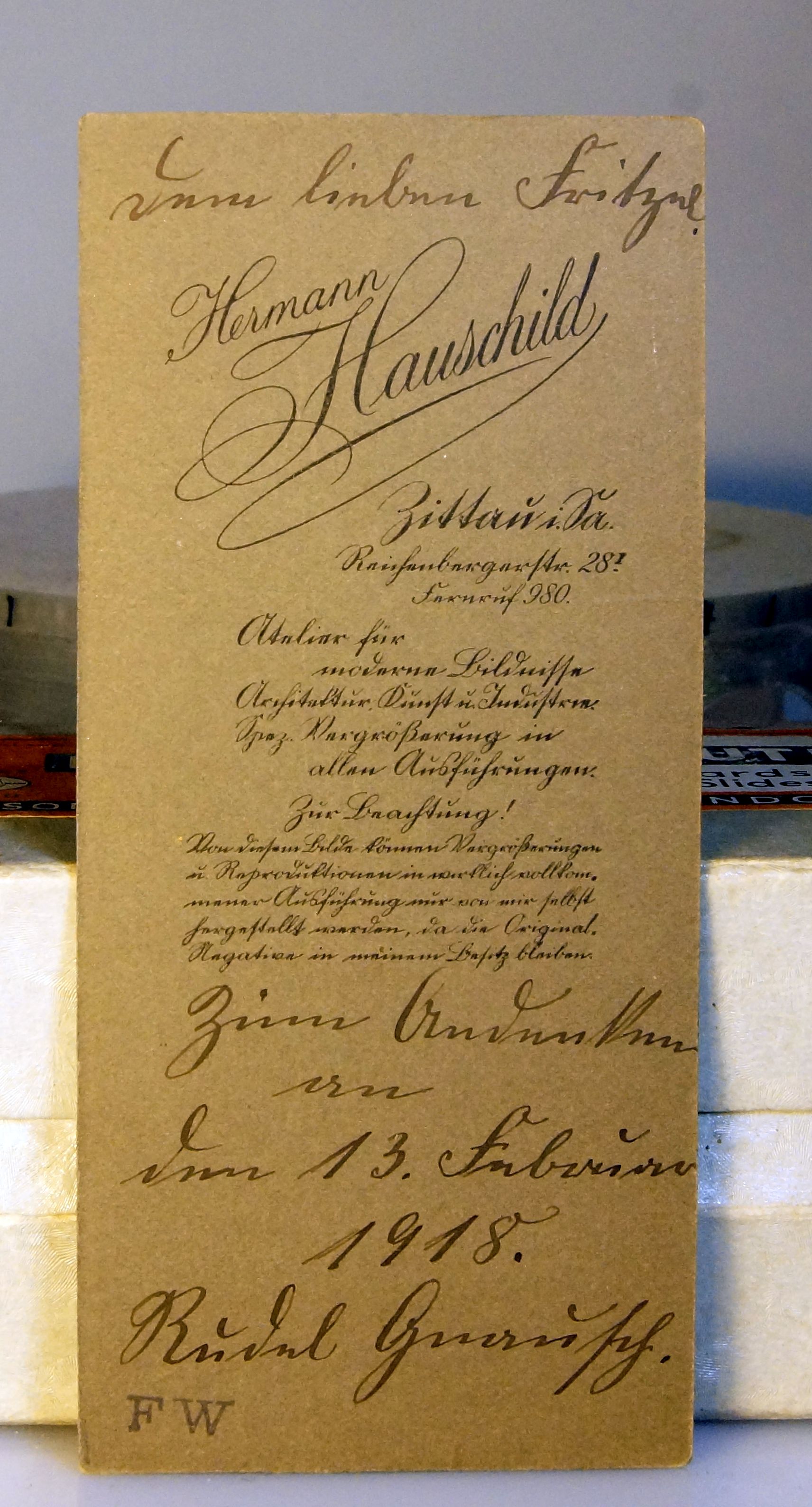 Dem lieben Fritze! Hermann Hauschild Zittau I. Sa. Reichenbergerstr. 28! Fernruf 280 Atelier für moderne Bildnisse AE Dünst (???) u. Industrie Spez. Vergrößerungen in allen Ausführungen Zur Beachtung! Von diesem Bilde können Vergrößerungen u. Reproduktionen in wirklich vollkommener Ausführung nur von mir selbst hergestellt werden, da die Original-Negative in meinem Besitz bleiben. Zum Bnduneskenn an Dem 13. Februar 1918 Rudel Geeaersch