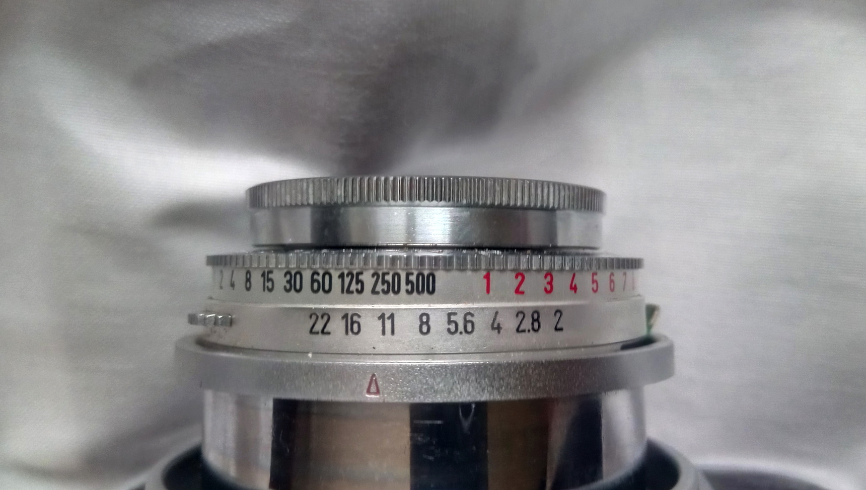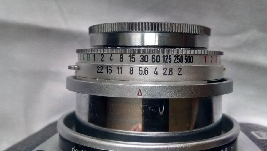 In diesem Fall 250stel Sekunde /Blende 2 bis halbe Sekunde / Blende 22. Alle übereinander liegende Kombinationen ergeben ein korrekt belichtetes Negativ. Da Blenden und Zeitring wieder miteinander verbunden sind, ist mit einem Dreh jede Kombination anwählbar.