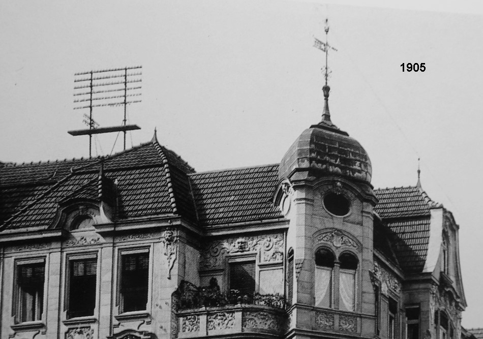 hier ein Fotoausschnitt einer Aufnahme von 1905. Dort sieht man gut auf dem Dach die Tragestruktur mit den Porzellanisolatoren für die diversen Telefonleitungen.