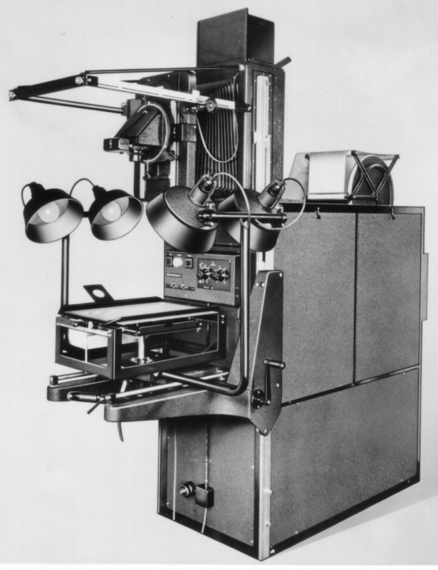 Ich habe ein Foto des Reproautomatenausgraben können. Er benötigte eine Fläche von 10m² sowie einen Wasser- und Stromanschluss. Originale bis A3 kamen auf den Aufnahmetisch, größere auf einen seitlich aufzustellenden, der Objektivkopf wurde dann um 90° gedreht. Die Kapazität betrug ca. 100 Repros in der Stunde, die Durchlaufzeit incl. Trocknen 15min.