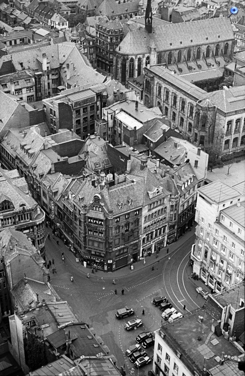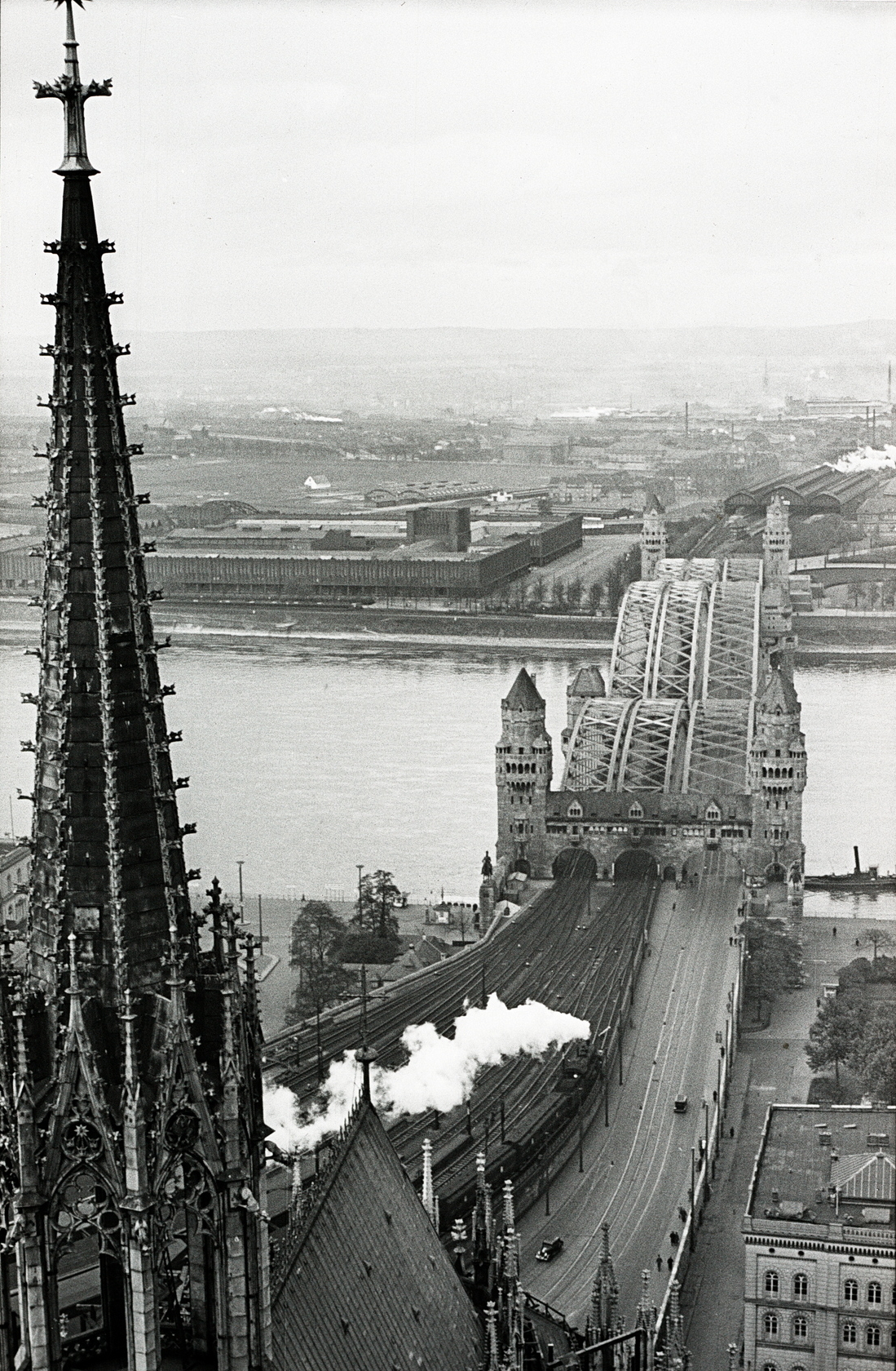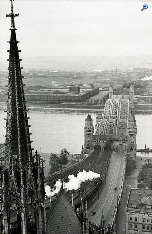 Ich habe mehrere Fotos, die mein Vater vor dem Krieg vom Kölner Dom herab mit einer Kleinbildkamera gemacht hat. Die Negative sind verbrannt. Alle Bilder wurden aber mit dem Leica Diakopiergerät in Dias umgewandelt und blieben als Filmrolle erhalten, leider ohne Datum. Diese Bilder habe ich abfotografiert. ("Kopie einer Kopie" bedeutet natürlich Qualitätsverlust.) Zwei Bilder haben unsere Väter etwa vom gleichen Standpunkt aus fotografiert. Vergleiche ich die Bilder, dann sehe ich, dass die meines Vaters später entstanden sind.