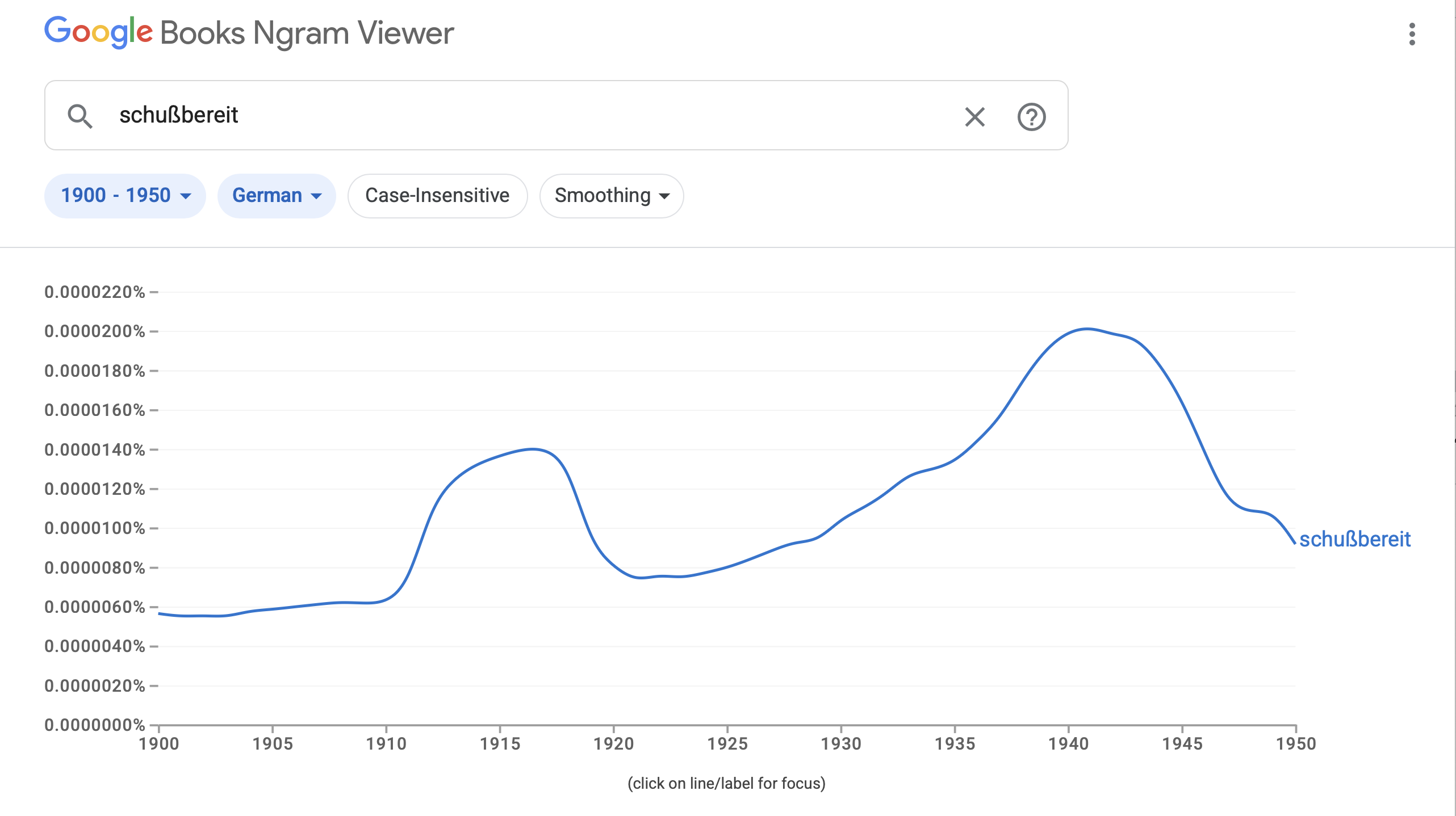 ja, schnelle Aufnahmebereitschaft war mit dem Aufkommen leichter und kleiner Kameras natürlich ein Werbeargument. Vielleicht ging es Axel aber auch um die militärische Metaphorik, die hier festzustellen ist und die es noch heute gibt: Man lädt seine Kamera mit Film, im englischen Sprachgebrauch gibt es ein shooting usw. Man müsste mal genauer anschauen, wann sich dieser Sprachgebrauch im fotografischen Bereich etabliert hat. Vielleicht ist die Annahme, dass Ende der 1930er Jahre militärischer Sprachgebrauch auch im Alltag üblich war, plausibel. Einen sehr groben Eindruck gibt eine Recherche mit dem Google NGram-Viewer, wonach die Frequenz des Adjektivs schussbereit in den von Google digitalisierten Büchern im Zeitraum 1914–18 und nach 1939 besonders hoch war:
