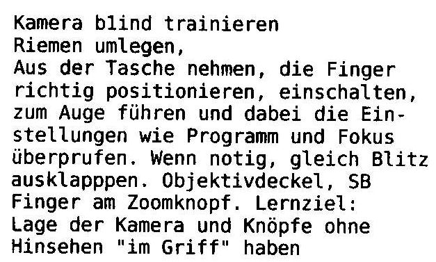Heutzutage ist der Text fünfmal so lange (habe ich abgedeckt), Makromodus, Zeit/Bl. manuell, Entfernung manuell oder unendlich usw. usf. Ich weiß garnicht, ob ich es gut finde, daß es -zig Kombinationen der Einstellungen vom letzen Mal gibt, die mir den anstehenden Schnappschuß vermasseln werden - und wenn die Sammelwut (Smartphone, DSLR, Digitalkameras en masse) es einem auferlegt, jede Menge Aufnahmegeräte einzuüben, wenn man wirklich immer "schuss"bereit sein will.