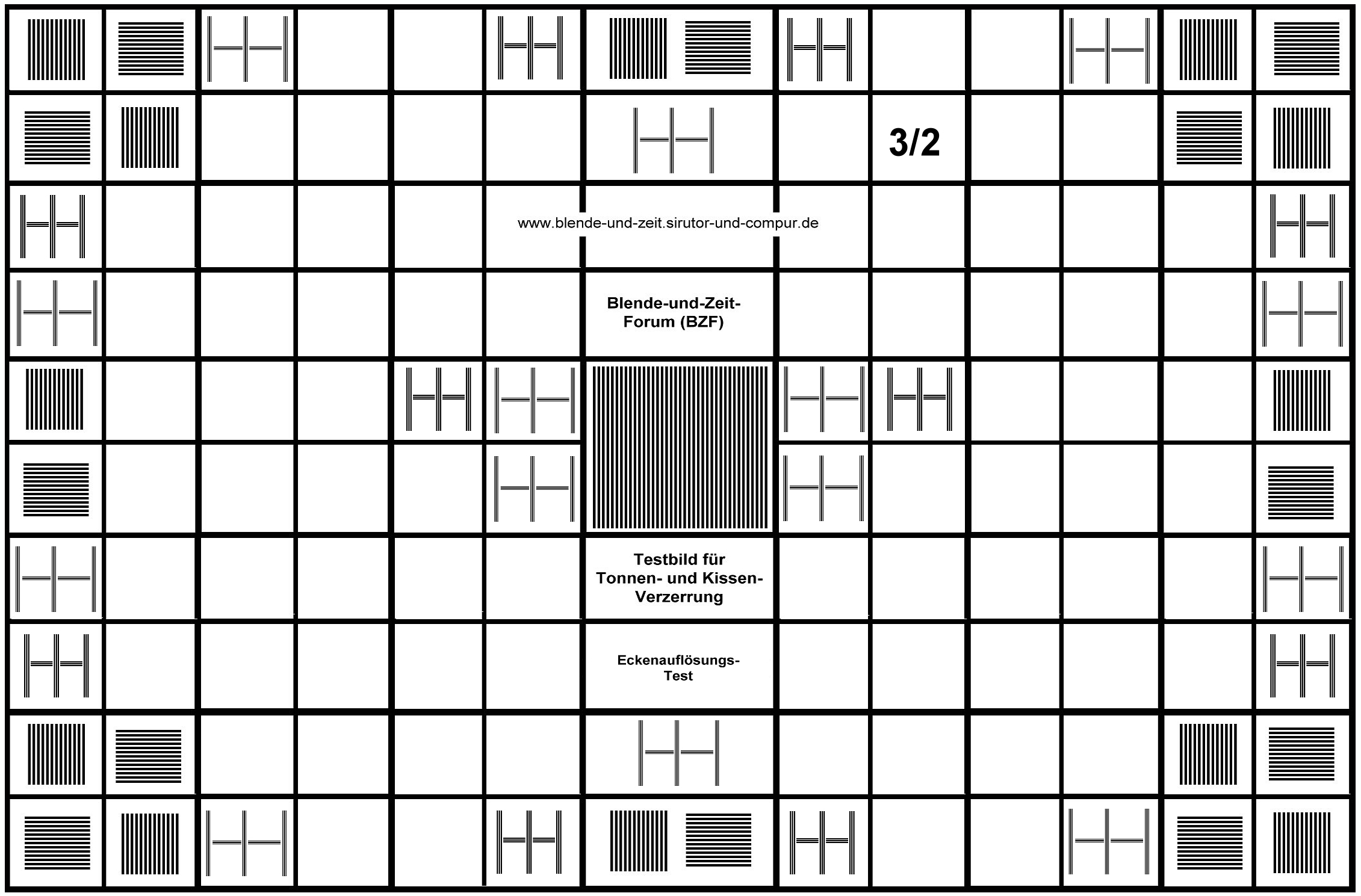 um besser erkennen zu können, ob eine Kamera (besser ein Objektiv) signifikante Tonnen- oder Kissen-Verzerrungen aufweist, kann das BZF-Testbild genutzt werden. In der Version II kann es auch für erste grobe Einschätzungen der Bildgleichmäßigkeit hinsichtlich der Bildschärfe genutzt werden