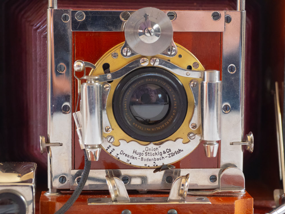 Erfreulicherweise nimmt die Kamera auch meine relativ modernen Linhof-Planfilmkassetten mit Millionenfalz; ich will als nächstes mal sehen, ob man damit noch fotografieren kann. Die Hartgummi-Verschlussektoren sind nicht ganz lichtdicht, bei starkem Licht scheint etwas Licht durch die Lamellen, und der Schlitzverschluss geht zwar inzwischen wieder wunderbar, ist aber löchrig wie ein Sieb. Mal sehen.