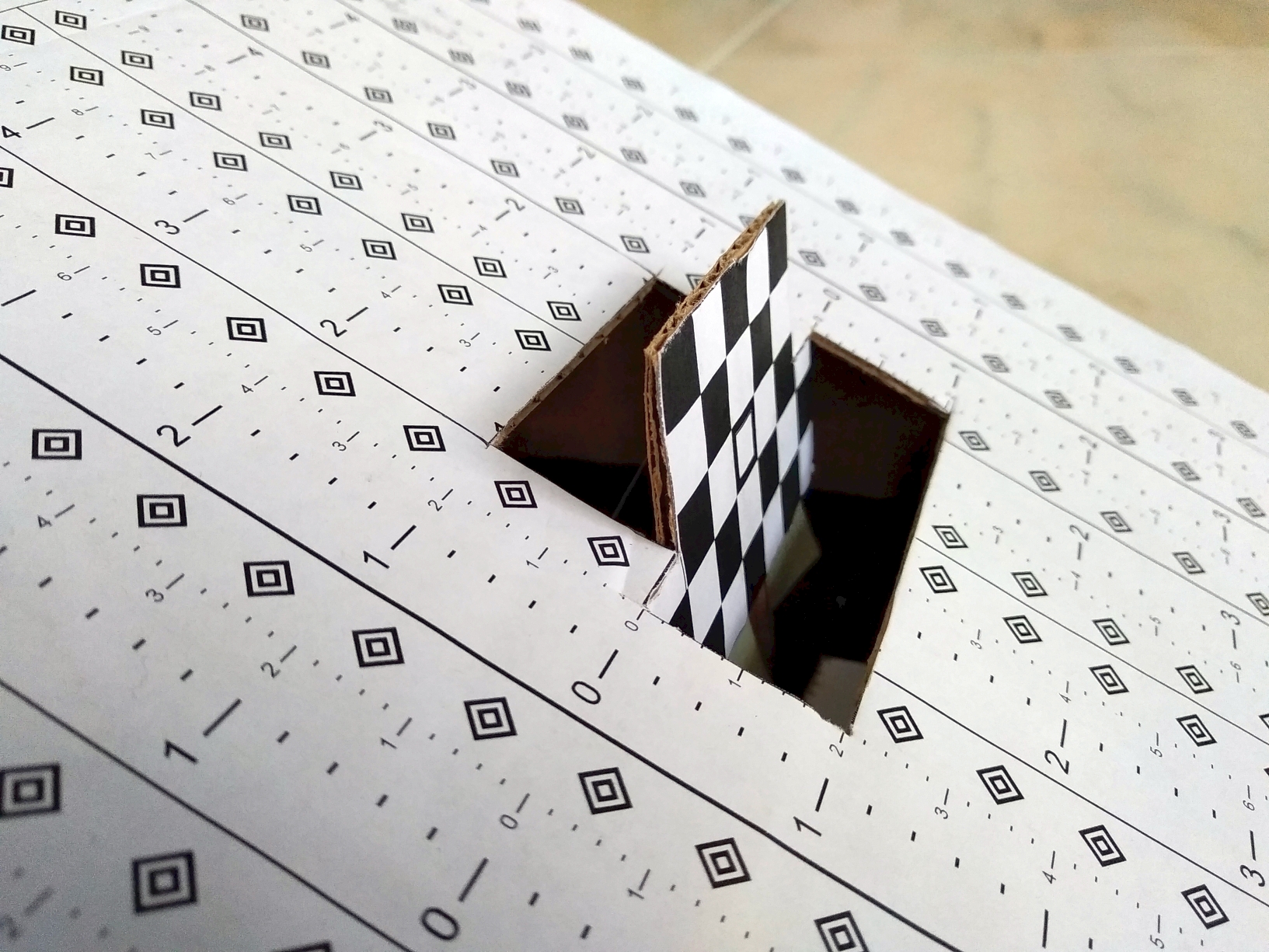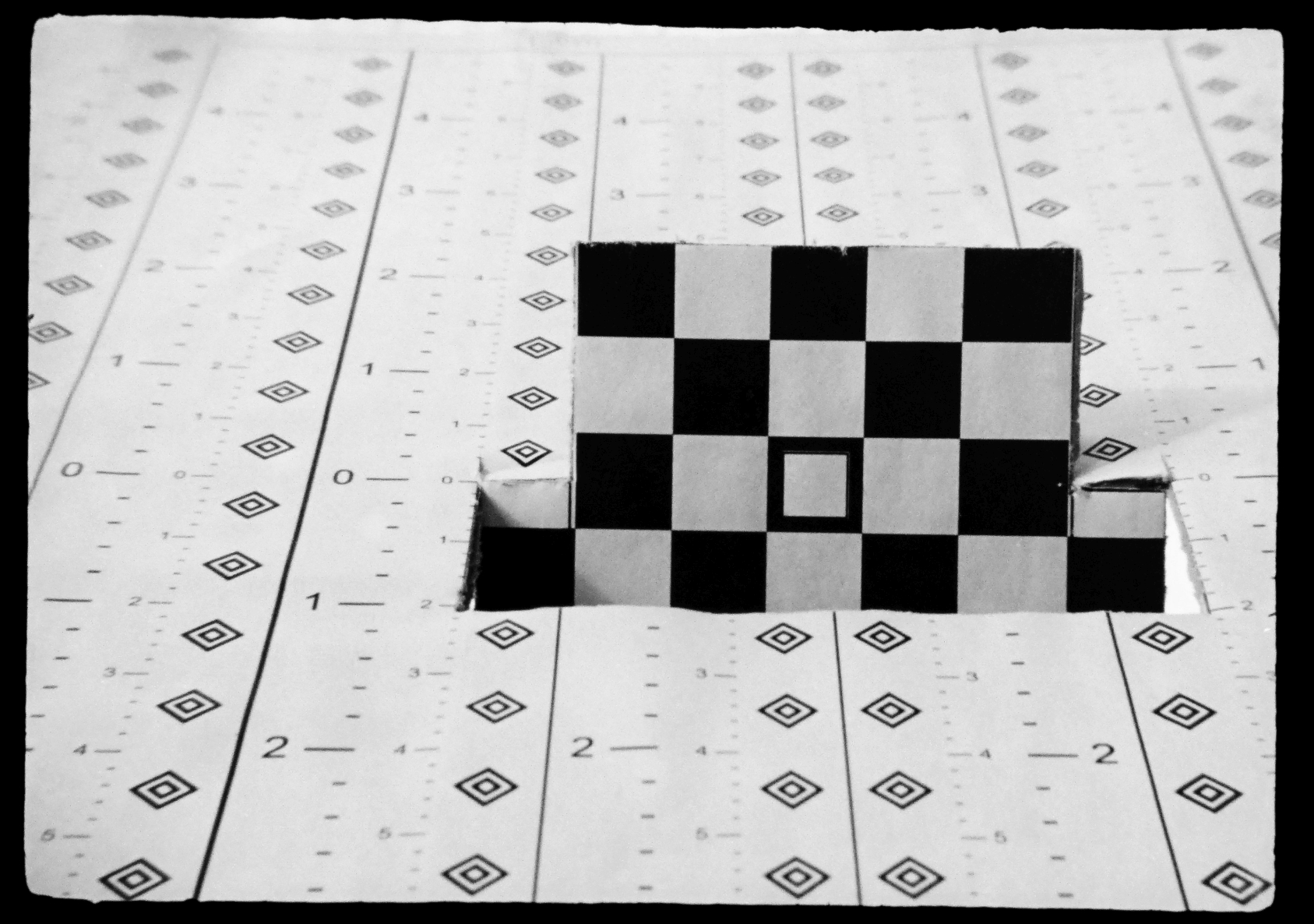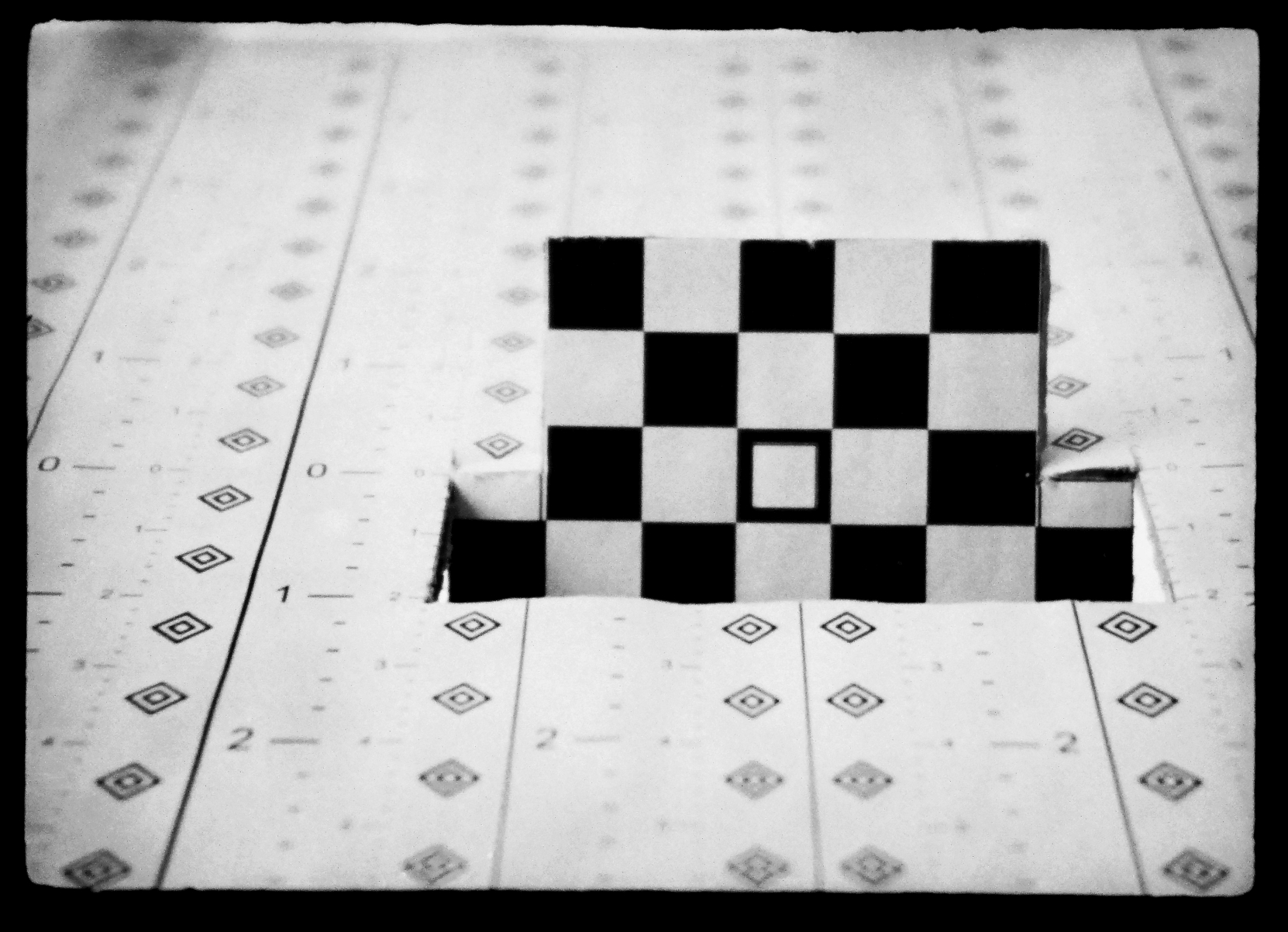 Um den Fokuspunkt bei der Naheinstellung zu prüfen, verwende ich einen Testaufbau, bei dem ich auf die senkrechten Felder in der Mitte fokussiere. Mit Hilfe der seitlichen Markierungen lässt sich später auf dem Foto die tatsächliche Schärfentiefe ausmessen. Testaufbau (Copyright: J. Klein):