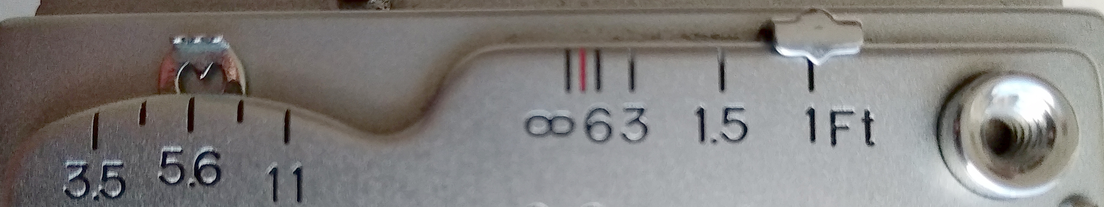 Auf dem ersten Foto mit Offenblende lässt sich erkennen, dass der tatsächliche Fokus fast 2 cm weiter vorne als eingestellt liegt. Dies könnte daran liegen, dass ich den Schieber der Entfernungseinstellung bei der Aufnahme einfach ganz nach rechts bis zum Anschlag geschoben habe. Wenn man aber ganz genau hinsieht, steht er dann aber nicht exakt auf 1 ft (= 30,48 cm), sondern ein wenig weiter rechts. Vielleicht ist das die Erklärung: