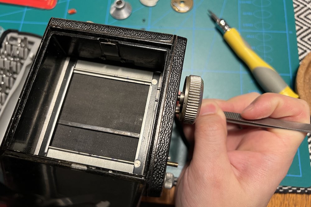If I remove the 1st curtain shutter speed selector, one small charging wheel and turn the 2nd curtain shutter speed selector with a tool, I can finally see the problem