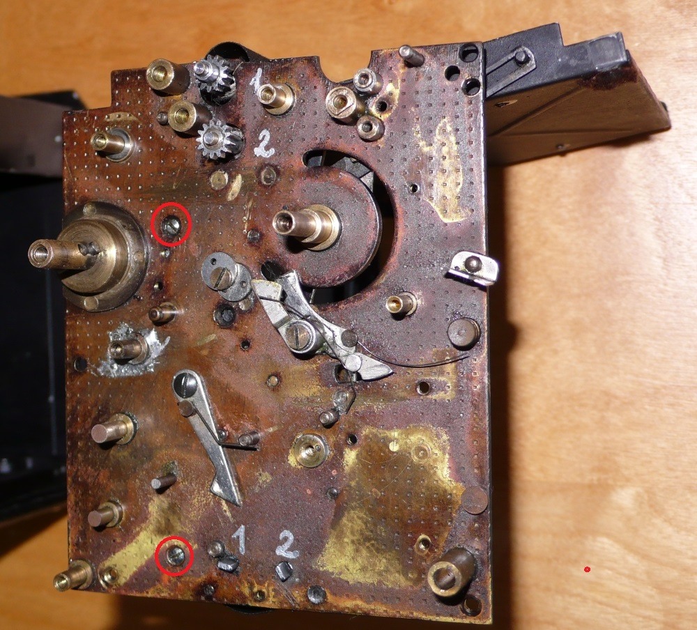 It's not necessary to remove the red marked screws in order to separate the whole mechanism from the shell! The screws for holding together the mechanism with the shell can be found near the corners. You have to remove both escapement mechanisms.