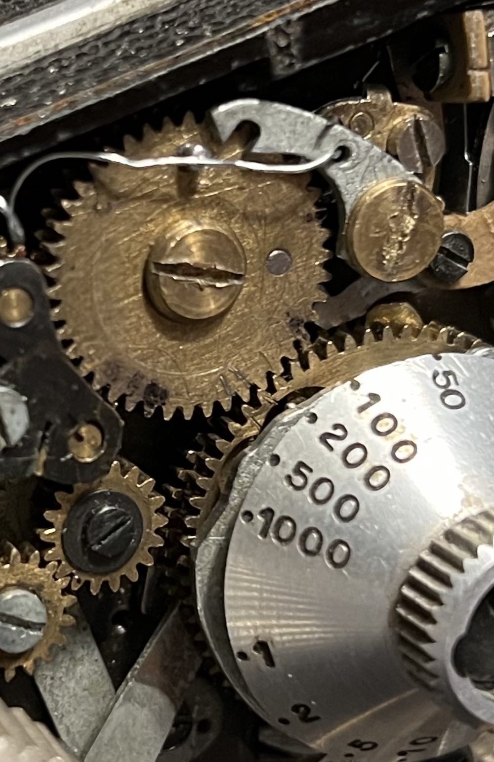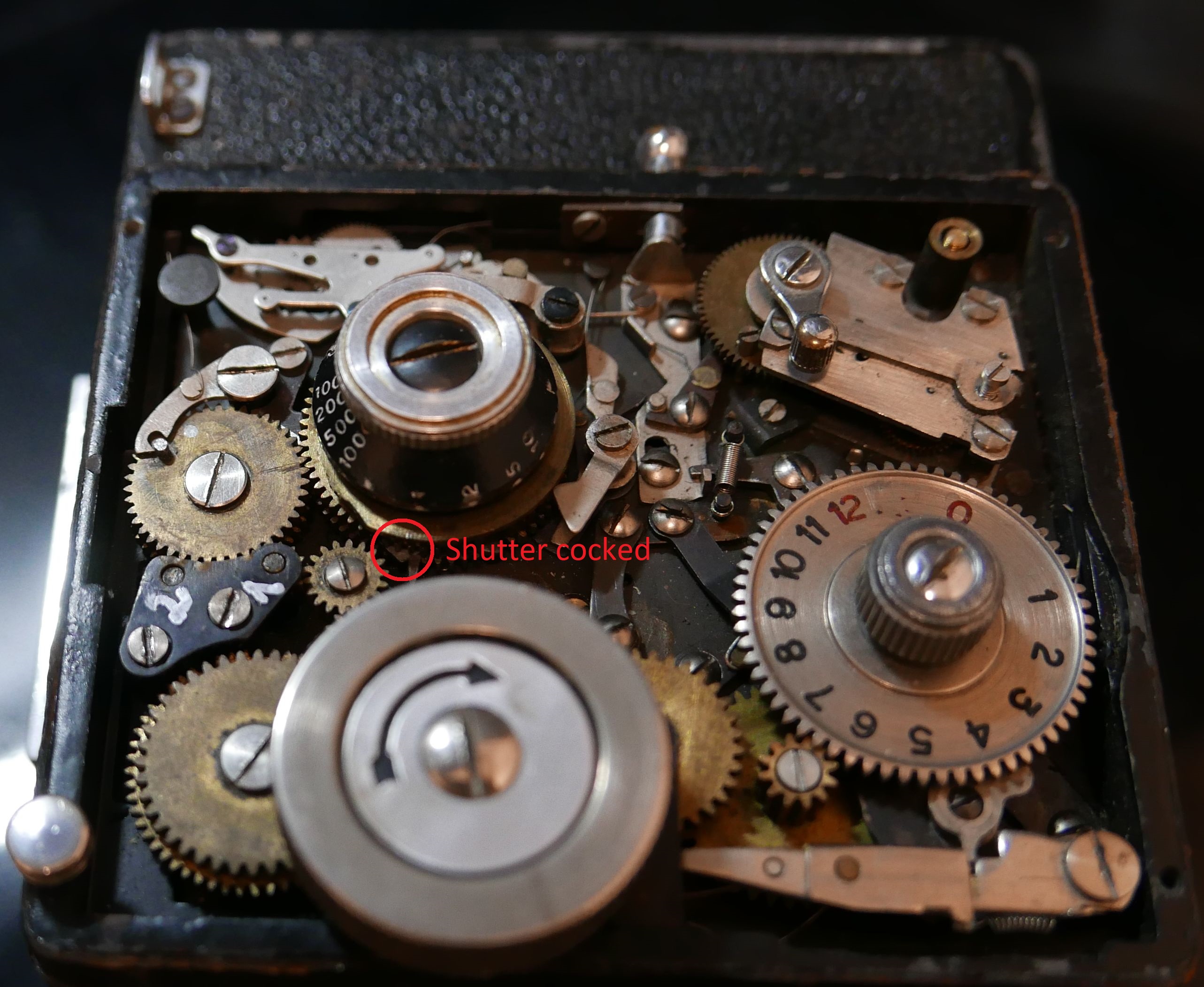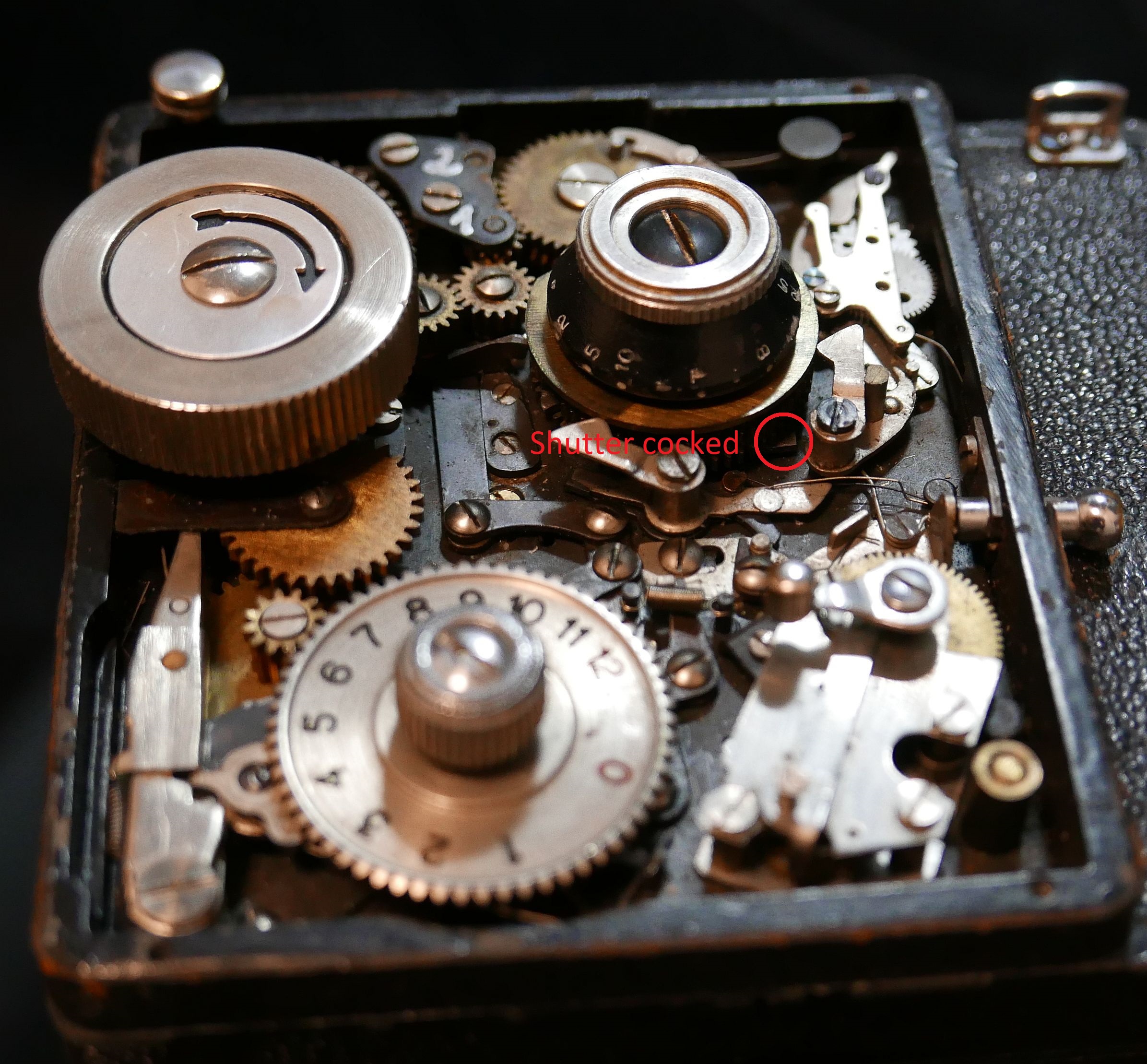 As can be seen from the cut outs under the shutter speed selector, the first curtain timing wheel is in a completely different position than what I have now. So back to the workbench (kitchen table).