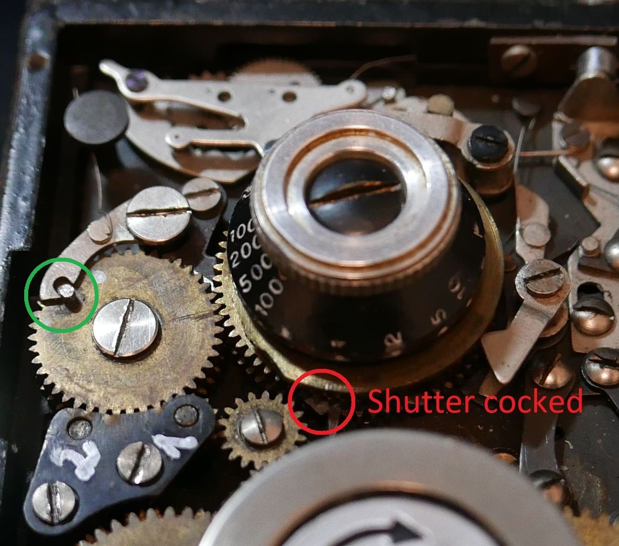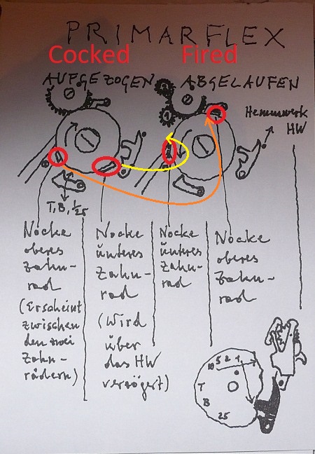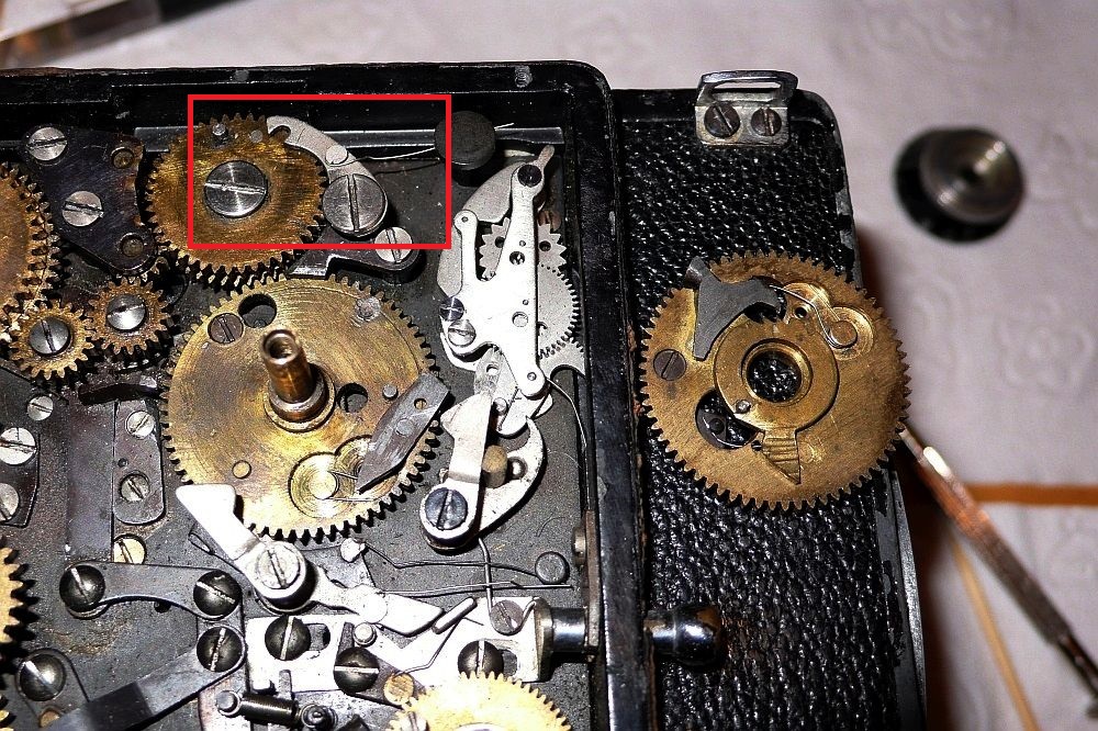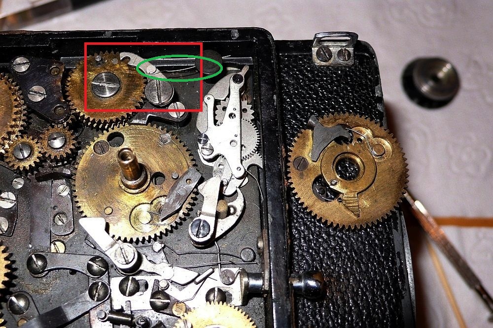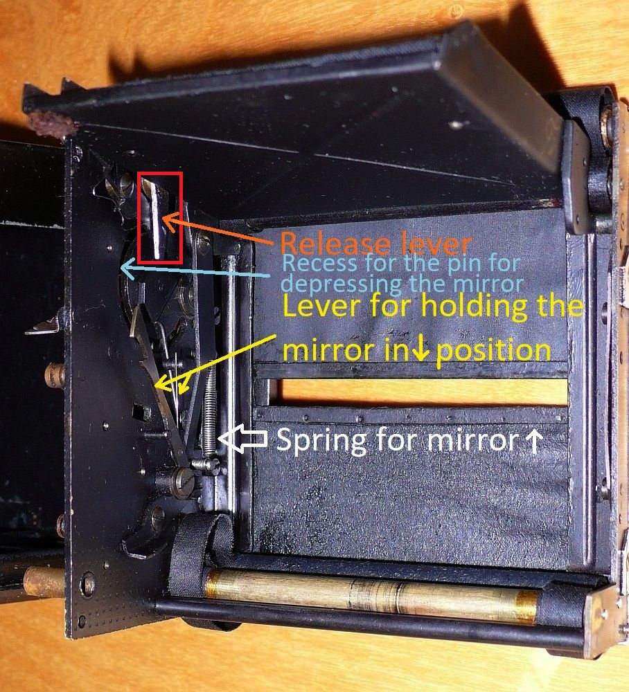 mazdaro:The "little arm" does not lock on the mirror (The mirror is locked on by a long arm inside of the box). It's the other way round: as I told you already, the mirror pushes up this arm and hence releases the gear (C1).