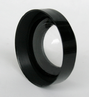 Weil das Schraubgewinde des Adapters nicht zum Olympusobjektiv passte, habe ich eine alte Sonnenblende mit 49 mm Gewinde innen auf den Durchmesser des Olympusobjektivs (42 mm) ausgefräst und so eine Aufsteckfassung geschaffen. Die asphärische Kunststofflinse wurde mit Plastikkleber in die Sonnenblende eingeklebt.
