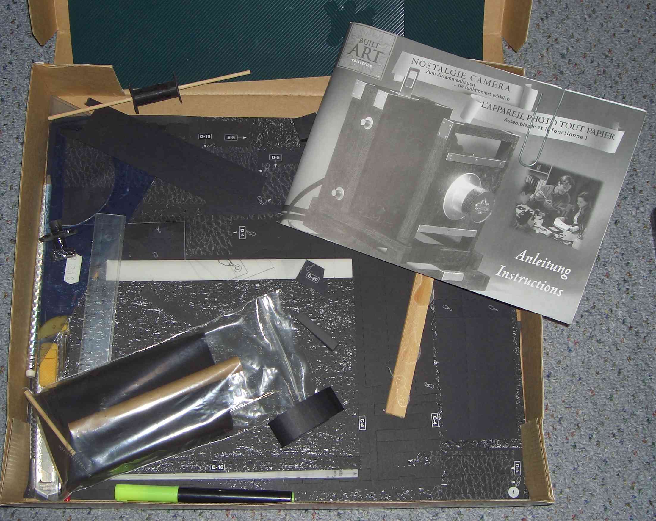 Ich habe einen Kamerabausatz bekommen,der schon mal begonnen wurde.Es ist auch noch viel Arbeit dran,die Anleitung umfaßt 76 Seiten und man muß alles herstellen,sogar die Zahnräder muß man kleben mit mehreren Schichten und sind ausgehärtet wirklich hart.Der Bausatz ist ungefähr 10 Jahre alt und anscheinend nicht mehr erhältlich zumindest habe ich nichts viel darüber gefunden.