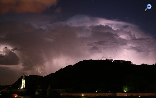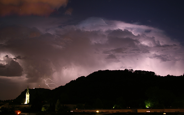 Das Gewitterbild besteht aus vier 30 Sekunden lang belichteten Einzelbildern. (Bei einem Bild mit 2 Minuten Belichtungszeit wäre die Kirche hoffnungslos überbelichtet).